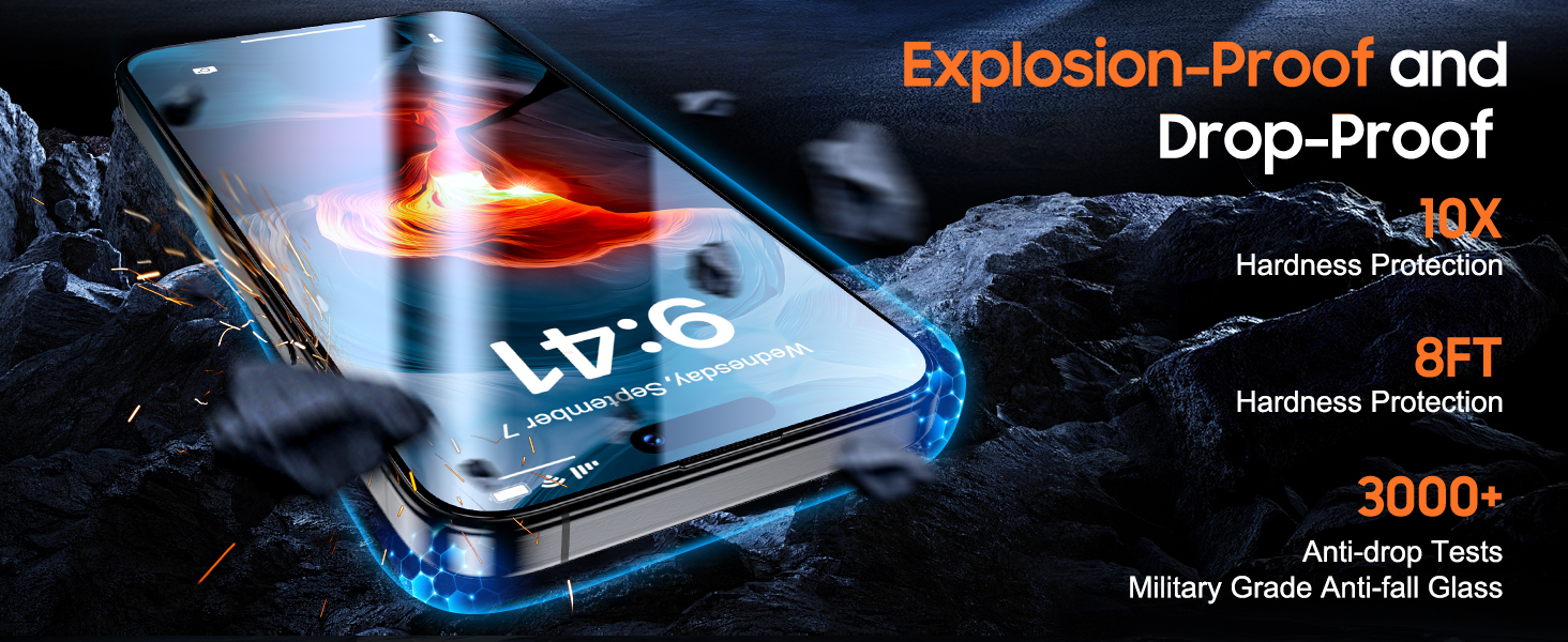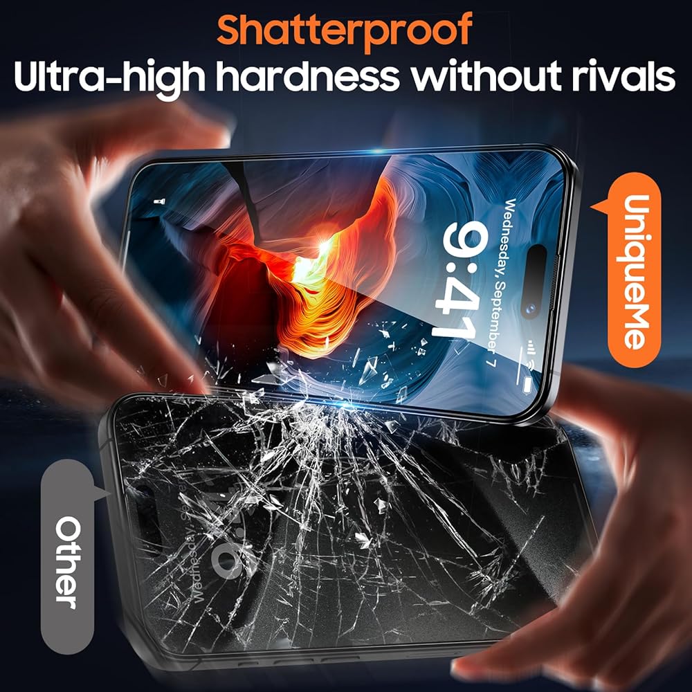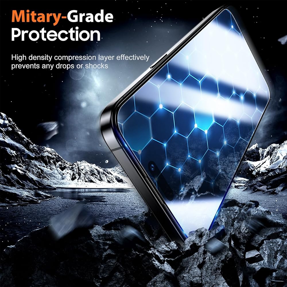• 【حماية ضد الكسر من الدرجة العسكرية】 متوافق مع iPhone 15 Pro Max. تم استخدام واقي الشاشة 15 pro max بتقنية Triple Ion-Exchange ويوفر صلابة أكثر من 9H وأقوى 10 مرات من الزجاج العادي. يتمتع هاتف iPhone 15 Pro Max الجديد الخاص بك بحماية جيدة، لذا يمكنك استخدامه بشكل فعال بثقة.