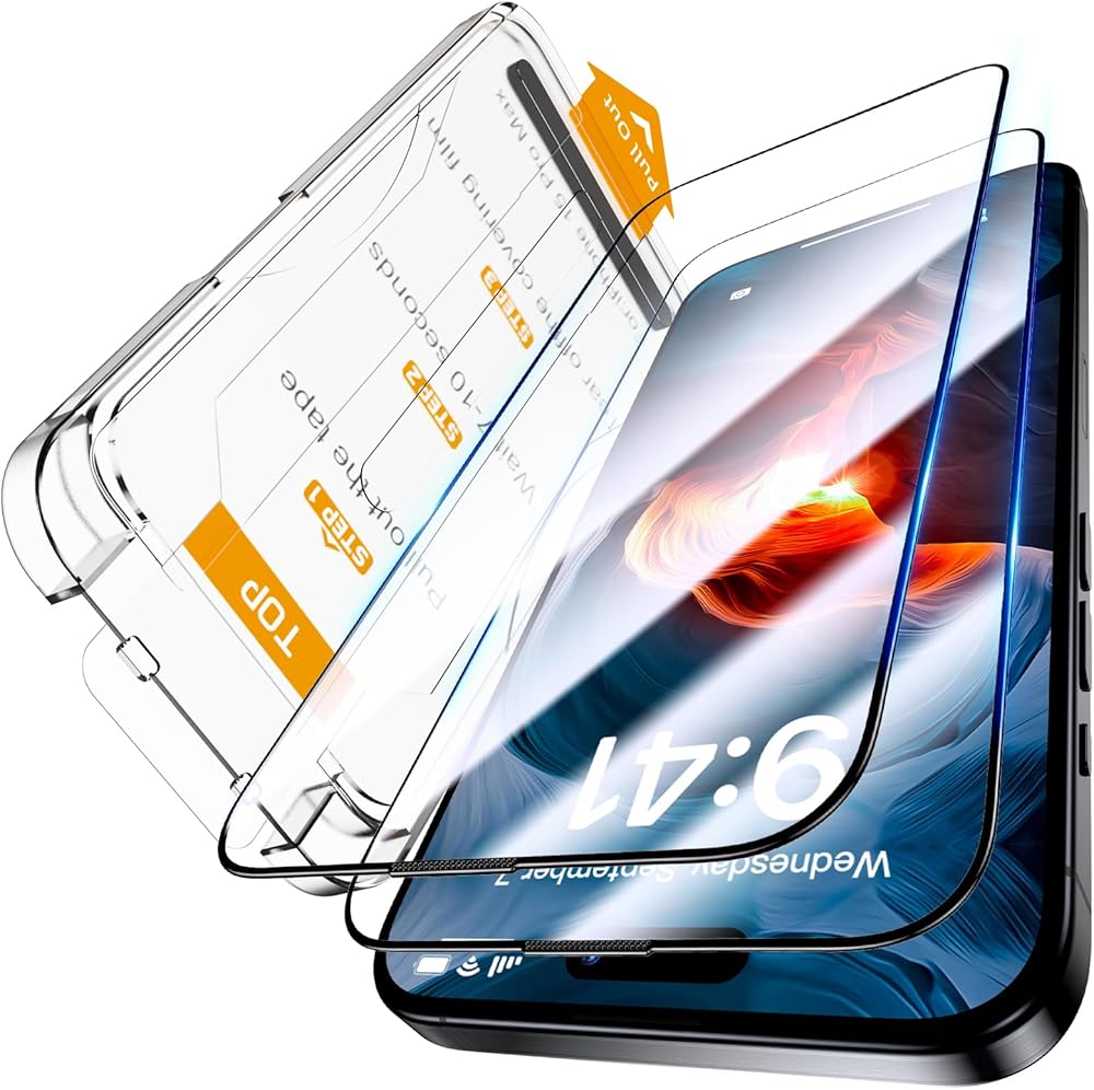 واقي شاشة UniqueMe لهاتف iPhone 15 Pro Max، [محاذاة تلقائية] إزالة الغبار تلقائيًا بصلابة 9H تغطية كاملة للشاشة من الزجاج المقوى الخالي من الفقاعات 6.7 بوصة - عبوتان