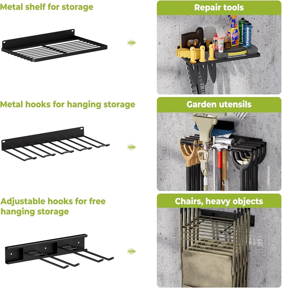 [منظم المرآب - متعدد الأغراض] تشتمل منظمات المرآب ونظام التخزين هذا على أنماط مختلفة من الخطافات التي تلبي احتياجاتك المتنوعة. يمكن استخدام جزء الرف من منظم أدوات المرآب هذا لحمل أشياء متنوعة، ويمكن للخطافات ذات الشكل الخفيف تعليق الأدوات والثقيلة يمكن للخطافات المتينة حمل مقاعد قابلة للطي ذات وزن كبير، وخراطيم، وغيرها من العناصر لتلبية الاحتياجات المختلفة لمنظمي المرآب والتخزين.