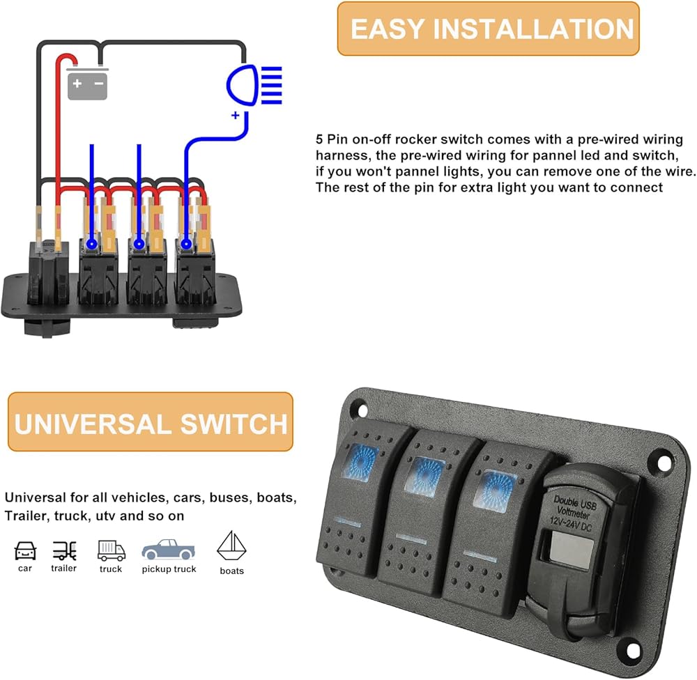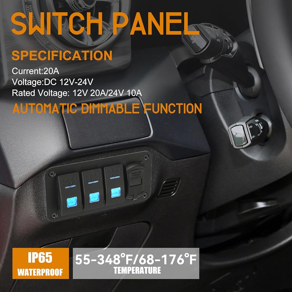 المتانة: لوحة التبديل الهزازة SUNPIE utv مصنوعة من مواد قوية، هذه الألواح متينة ومقاومة للتآكل، مما يجعلها مناسبة للاستخدام في بيئات مختلفة، بما في ذلك التطبيقات البحرية وتطبيقات الطرق الوعرة.