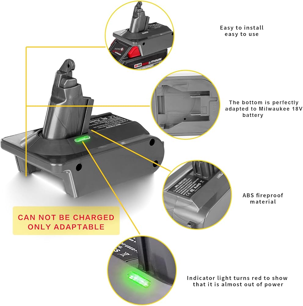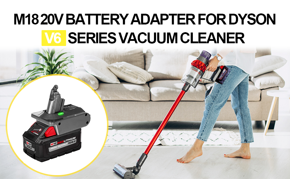 • 【سهل الاستخدام】محول المحول V6 الخاص بنا سهل الاستخدام بشكل لا يصدق. كل ما عليك فعله هو إدخال بطارية Milwaukee في قاعدة المحول وتوصيلها معًا بالمكنسة الكهربائية اللاسلكية Dyson V6. عند الانتهاء من التنظيف، ما عليك سوى إزالة المحول من المكنسة الكهربائية والبطارية من المحول.