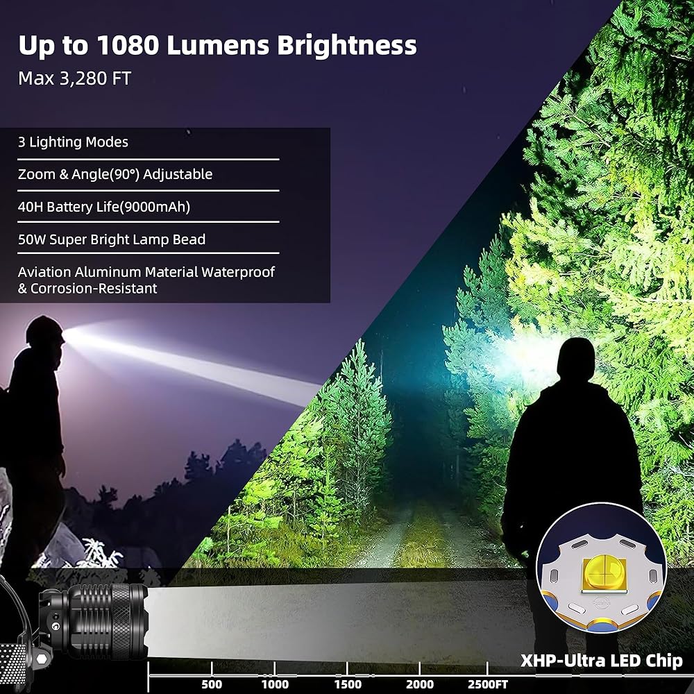 Zmoon 100,000LM مصباح أمامي LED قابل لإعادة الشحن، عمر بطارية طويل 40 ساعة، مصباح رأس مستشعر فائق السطوع مع 3 أوضاع إضاءة | زوومابلي | عرض الطاقة | IP67 مقاوم للماء للتخييم والصيد والمغامرات والمشي لمسافات طويلة