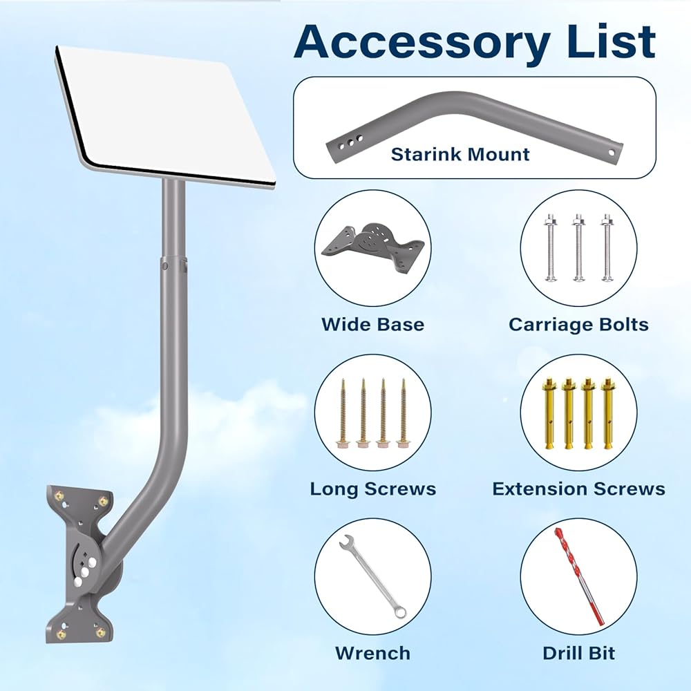 حزمة شاملة كليًا: تتضمن مجموعة تركيب ستارلينك جميع المكونات الضرورية للتركيب، مثل بما في ذلك دعامة التثبيت، وحامل القاعدة، والعمود، والمسامير، ومفتاح الربط والمثقاب، مما يقلل من حاجة المستخدمين إلى شراء أجهزة إضافية بشكل منفصل.