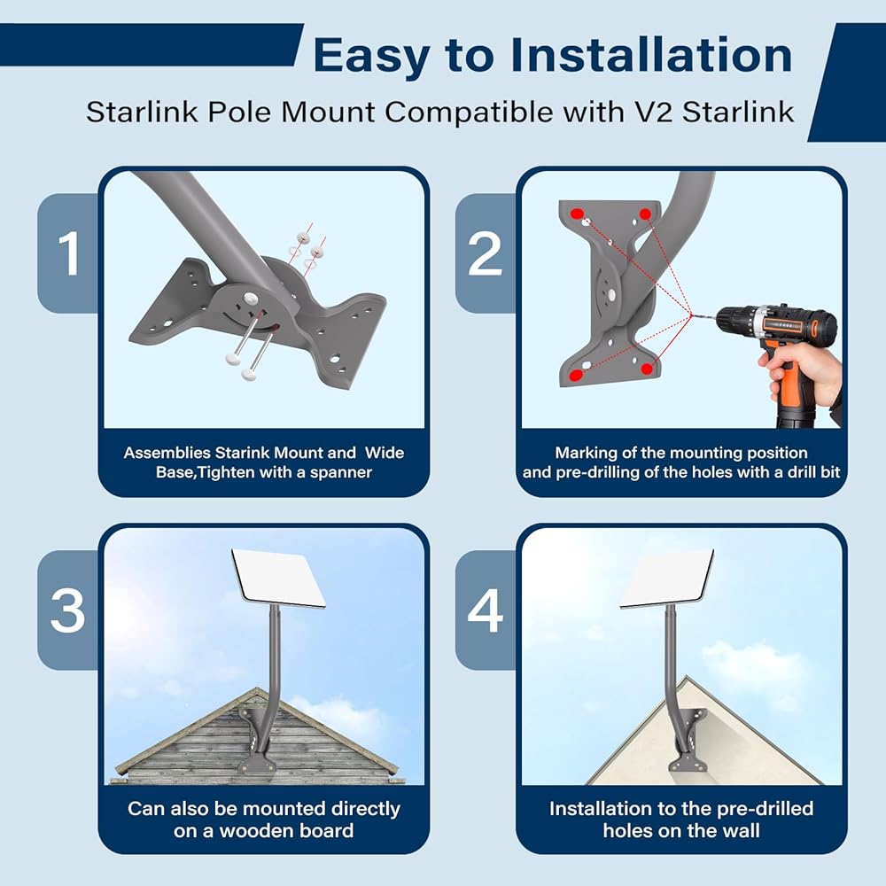 متطابقة تمامًا: تم تصميم مجموعة تركيب Starlink لطبق الإنترنت عبر الأقمار الصناعية Starlink مع فتحات مربعة دقيقة بين الدعامة وصارية Starlink، فقط اضغط على المشابك الموجودة على قضيب Starlink لتثبيتها في الفتحات المربعة للدعامة، لا حاجة إلى محولات إضافية و مسامير.