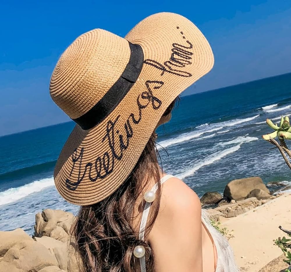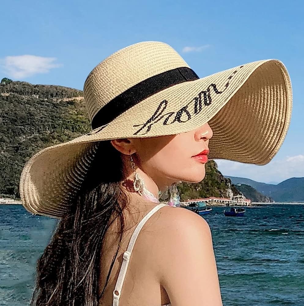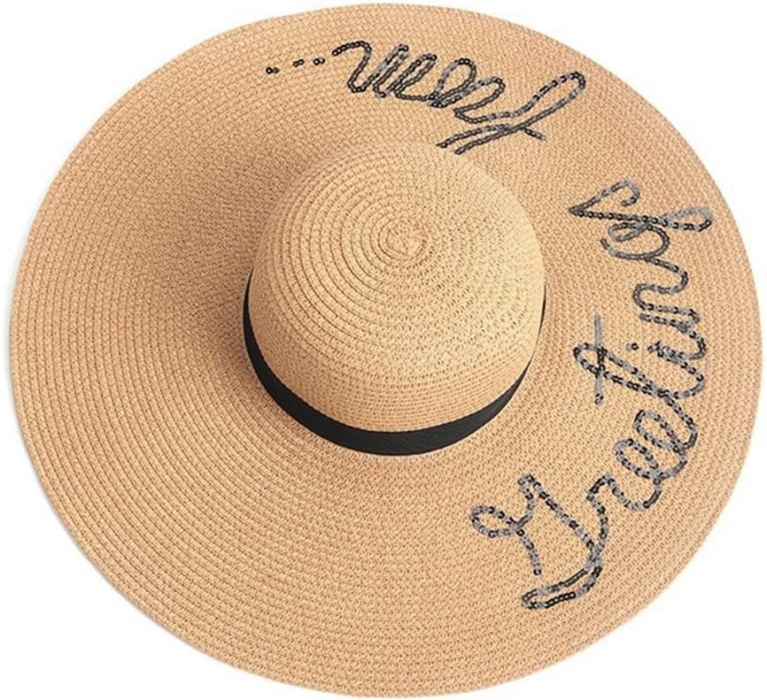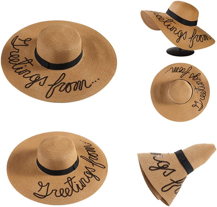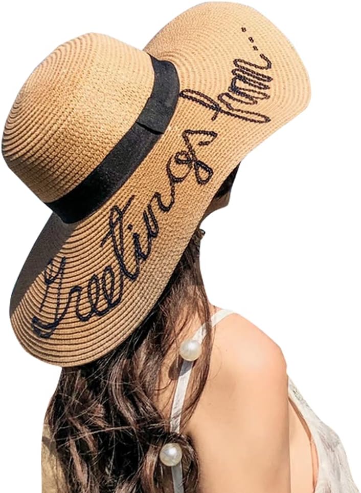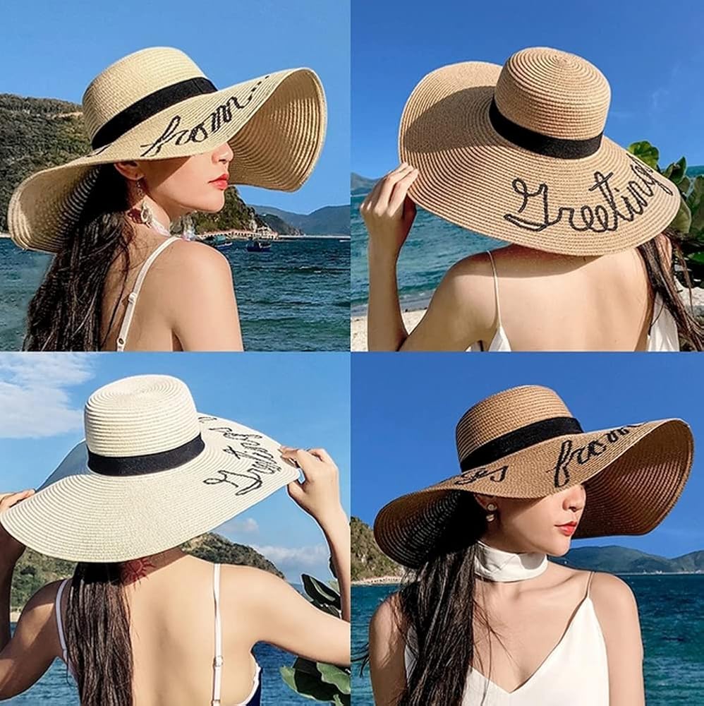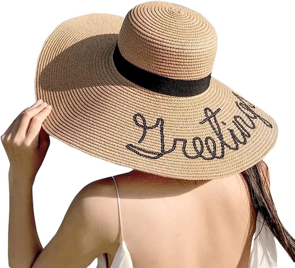 Women Girls Large Brimmed Summer Straw Hat Foldable Floppy Beach Cap Wide Brim Sun Straw Hat with Fashion Embroider UV UPF 50 for Travel Vacation (Khaki)