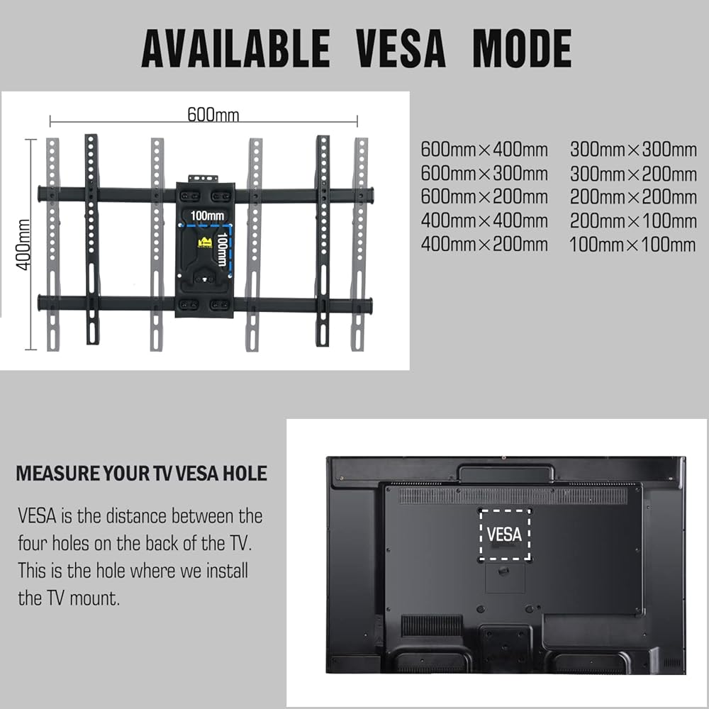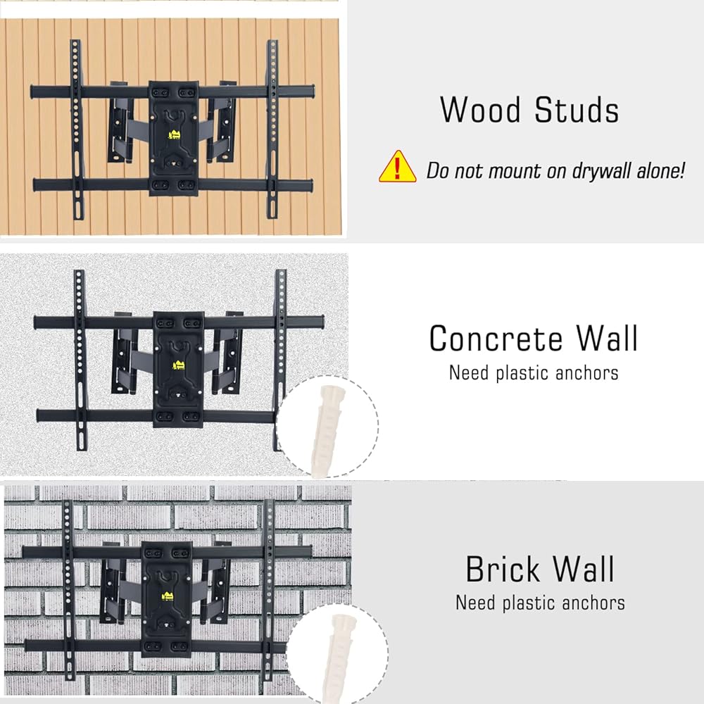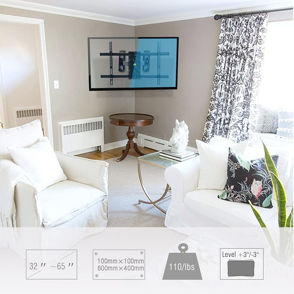 حامل تلفزيون زاوية عالمي: هذا الحامل الجداري ذو الحركة الكاملة يناسب معظم أجهزة التلفاز LED وLCD وOLED و4K مقاس 32-65 بوصة التي يصل وزنها إلى 110 رطل. أنماط VESA: 600x400/600x300/600x200/400x400/400x200/300x300/300x200/200x200/200x100mm/100x100mm. ملحوظة: يرجى عدم وضعه على الحوائط الجافة.
