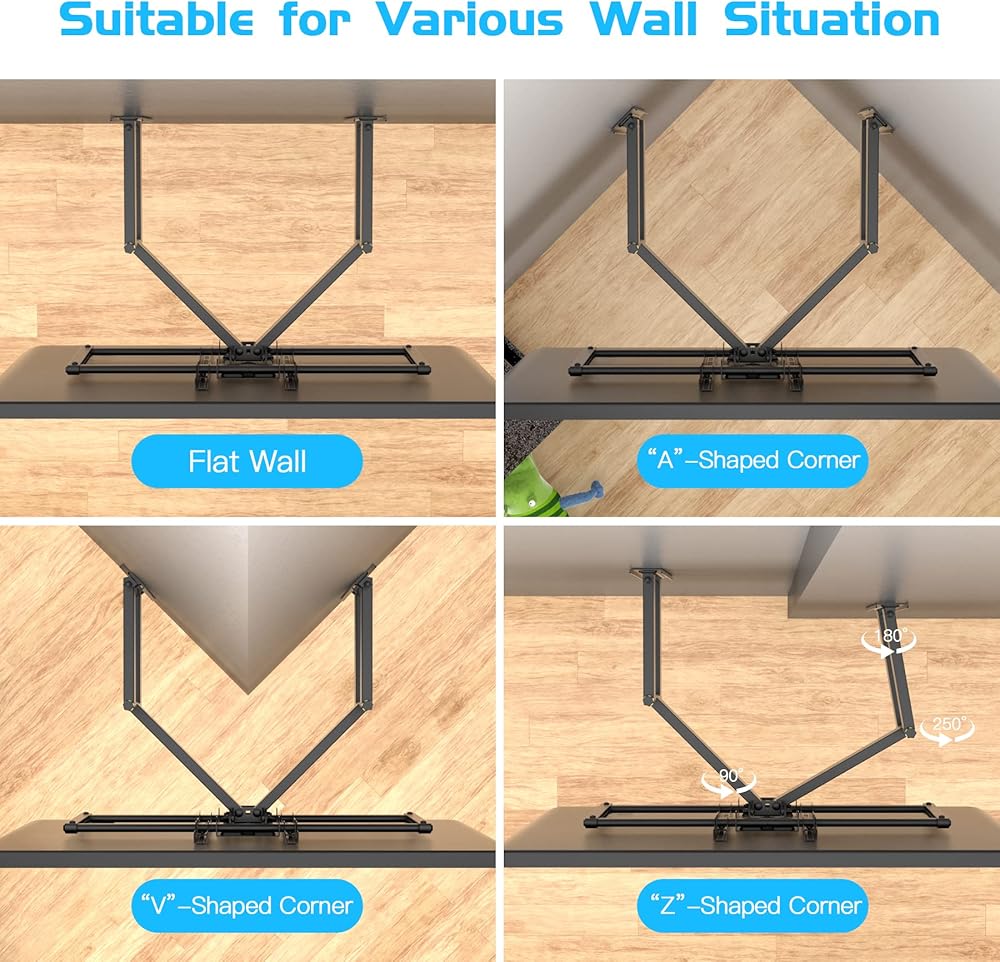 استفد بالكامل من مساحة الزاوية الخاصة بك - من خلال الجمع بين قوة الأذرع المفصلية ذات الحركة الكاملة ولوحة الحائط ذات المسامير الفردية، فإن حامل التلفزيون في الزاوية الخاص بنا أكثر ثباتًا وأسهل في التكيف مع الزاوية المرغوبة عند التركيب في زاوية زاوية ويسمح لك بعمل أفضل استغلال المساحة في منزلك