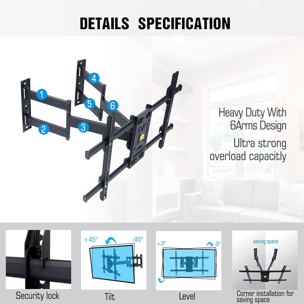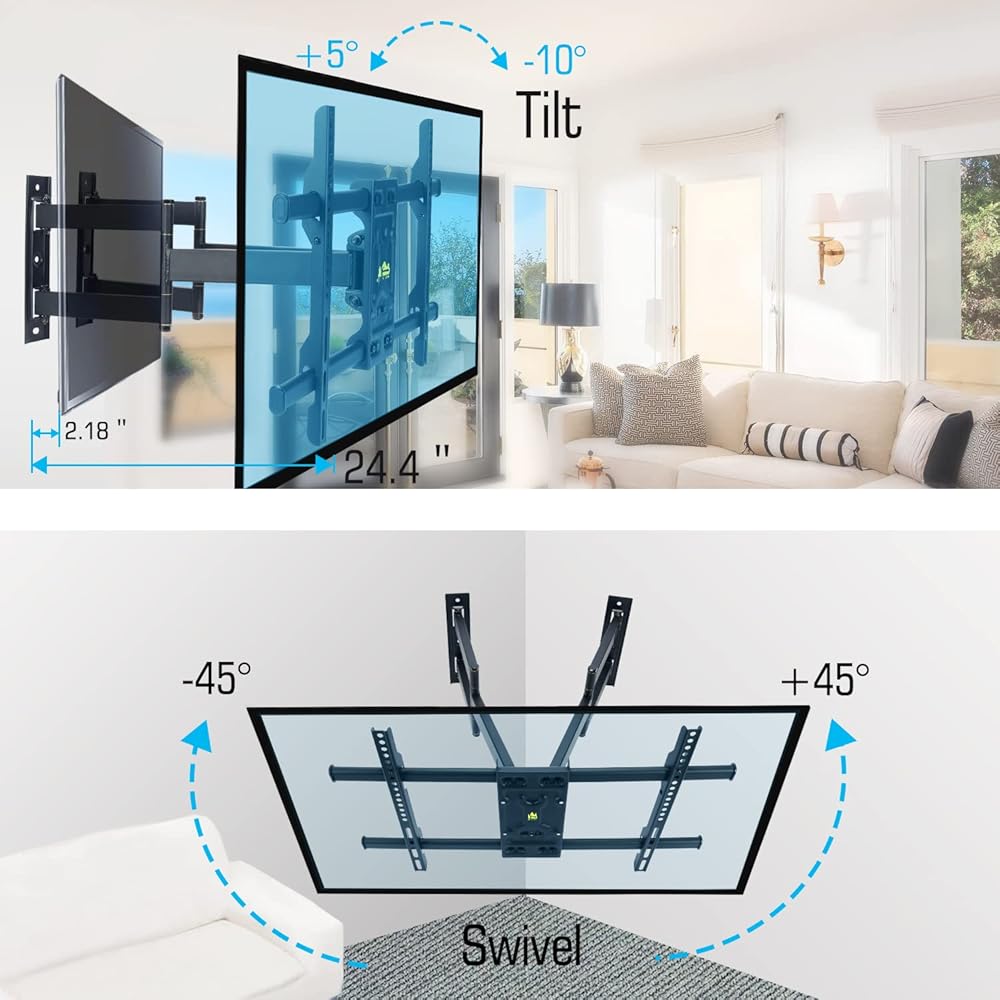نطاق كامل للتعديل: يأتي حامل التلفزيون ذو الحركة الكاملة هذا مع إمالة +5 درجة/-10 درجة، ودوران 45 درجة (زاوية الدوران القصوى تعتمد على حجم التلفزيون) وضبط مستوى +/-3 درجة. قم بتأرجحه إلى أي زاوية ترغب في المشاهدة منها، ثم قم بإعادته بسهولة عندما لا تستخدمه. تتيح لك أيضًا إمالة التلفزيون لأعلى أو لأسفل، مما يحل مشكلة وهج التلفزيون المزعجة