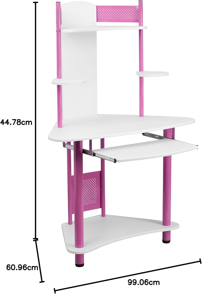 Add a cool, compact workstation to your kids bedroom and get organized with this tall computer desk with integrated hutch. This computer workstation provides a convenient workspace with a splash of color that will appeal to both kids and adults. Store all of your components within this computer desk, CPU, monitor and keyboard or laptop as well as a printer, and speakers. The pull-out keyboard platform can store your keyboard away when no longer needed. This desk provides a great option for studying or for casual computer usage. The white corner desk with blue accents provides a small footprint that will not interfere in your walk space.