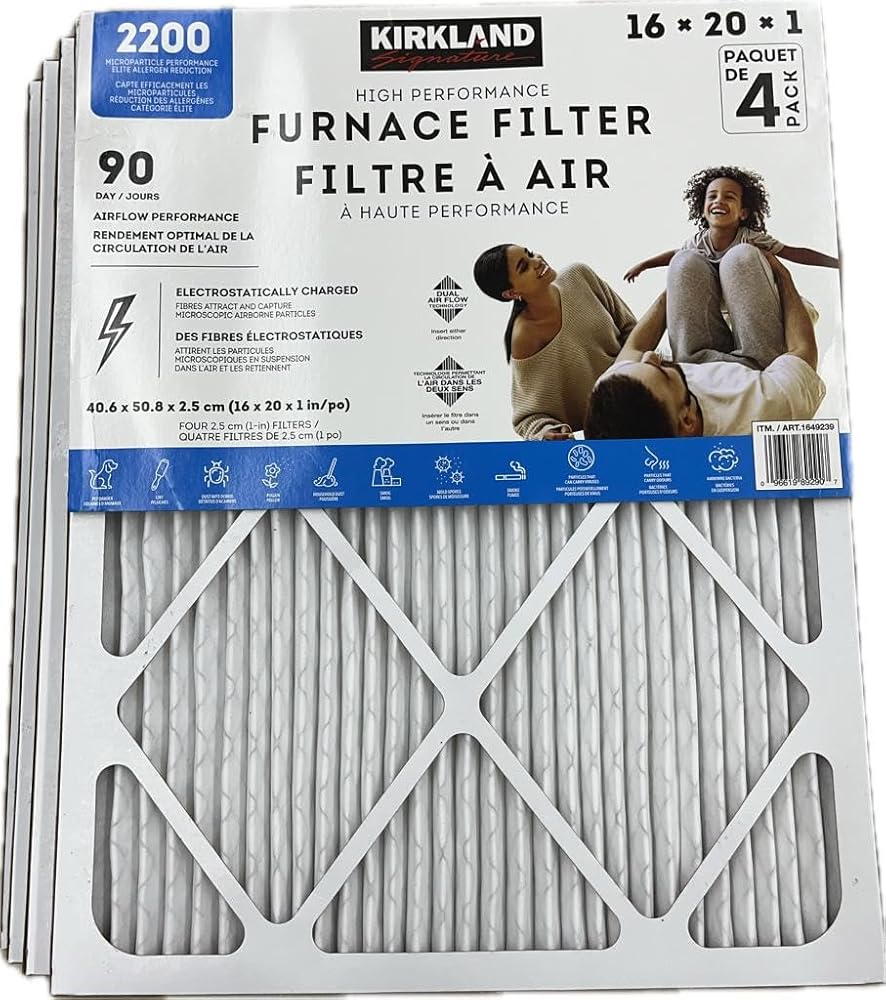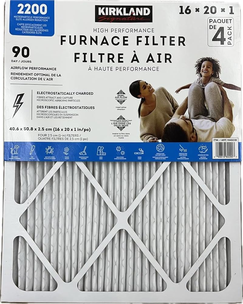 Kirkland Signature Air Filters are the perfect tool for your home HVAC systems. They lower energy consumption, protect the HVAC equipment better due to a lower in-use pressure drop, and hold more dust and particulates, lasting 90 days compared to the competitive air filtration products. Features: * Electrostatically Charged Fibers Attract and Capture Microscopic Airborne Particles * 90 Day Air Flow Performance * Dual Airflow Technology. Insert Filter in Either Direction Captures: Smoke / Pet Dander / Lint / Dust Mite Debris / Pollen / Smog / Particles that can Carry Viruses / Household Dust/ Mold Spores / Particles that Carry Odors * Captures and Holds 30% More Dust and Particulates than other Elite Allergen Filters in the Market