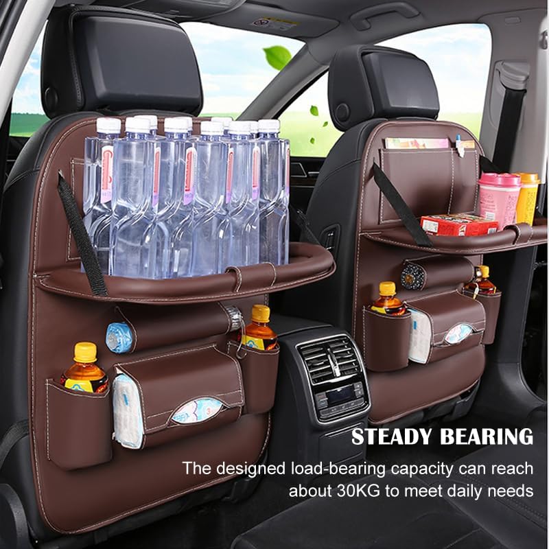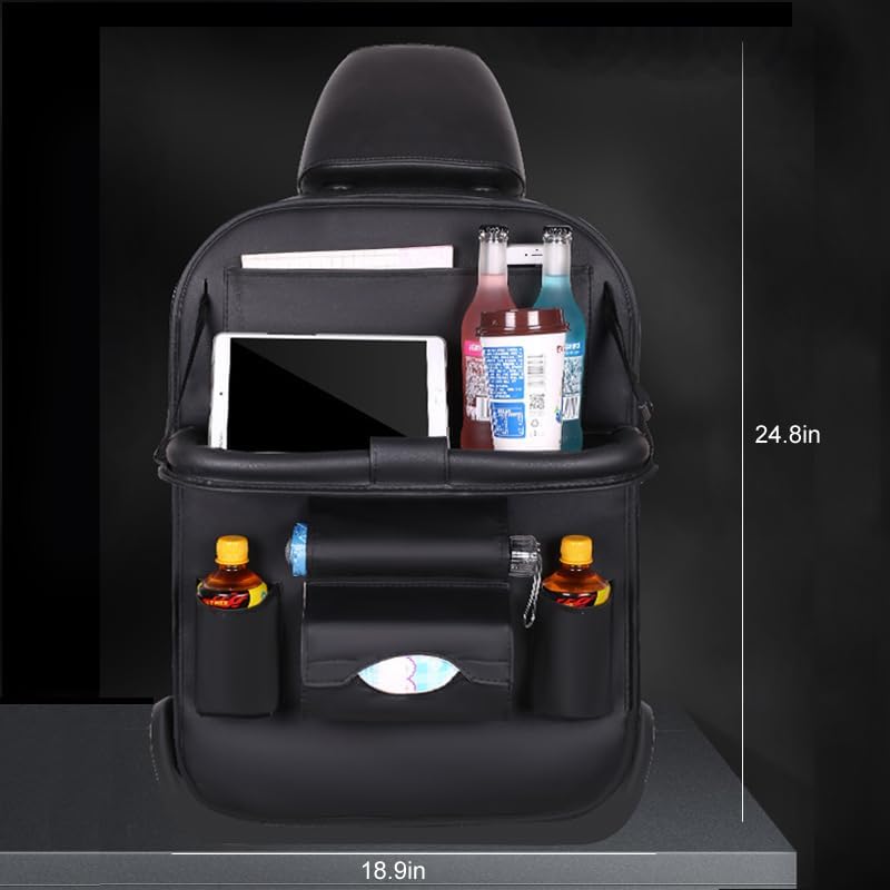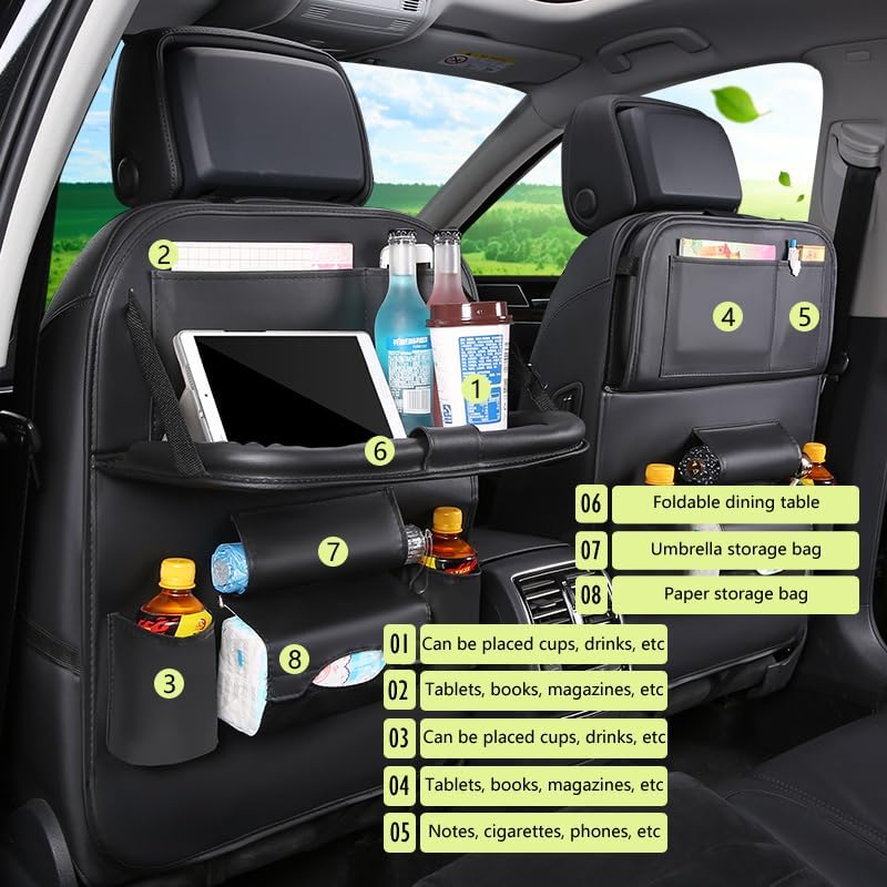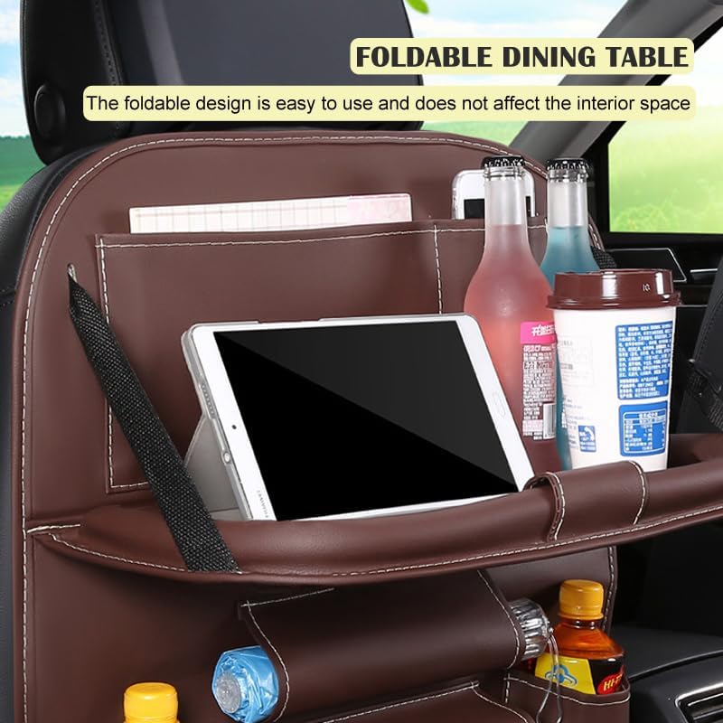 منظم المقعد الخلفي للسيارة قابل للطي، حقيبة تخزين جلدية متعددة الوظائف، مع طاولة طعام و7 جيوب تخزين، سجادات واقية، سهلة التنظيف