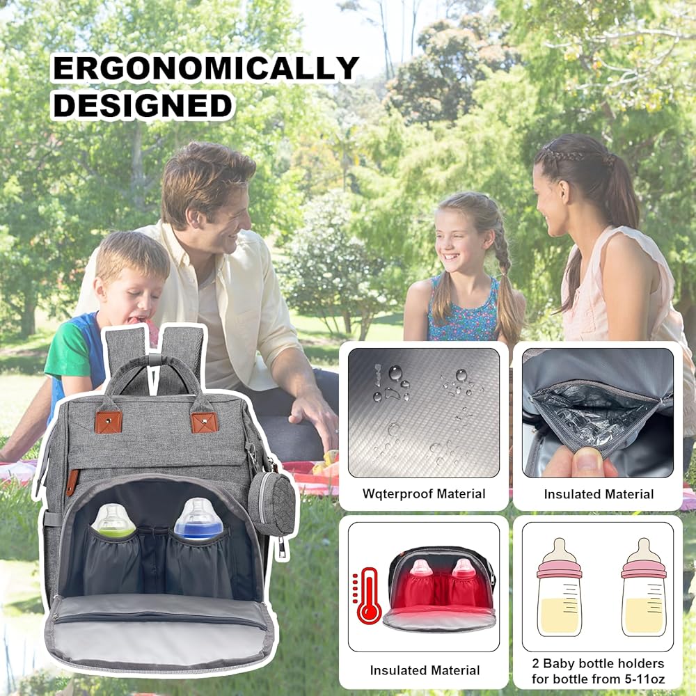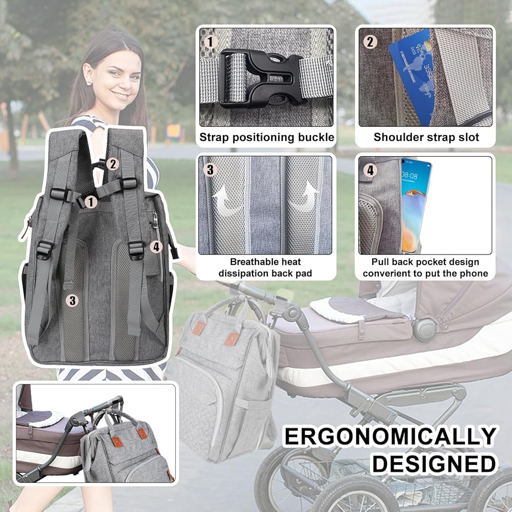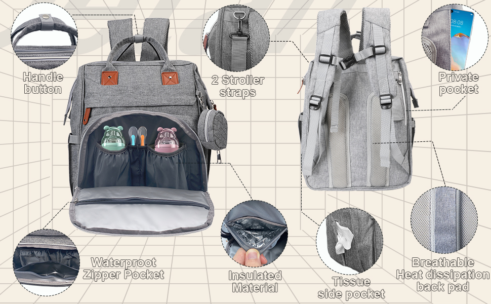 تنظيم محسّن: تتميز حقيبة الظهر للحفاضات الخاصة بنا بحجرتين واسعتين للإغلاق بسحاب و14 جيبًا، مصممة لتخزين جميع مستلزمات طفلك الأساسية دون عناء مع الحفاظ على مظهر أنيق ومنظم.