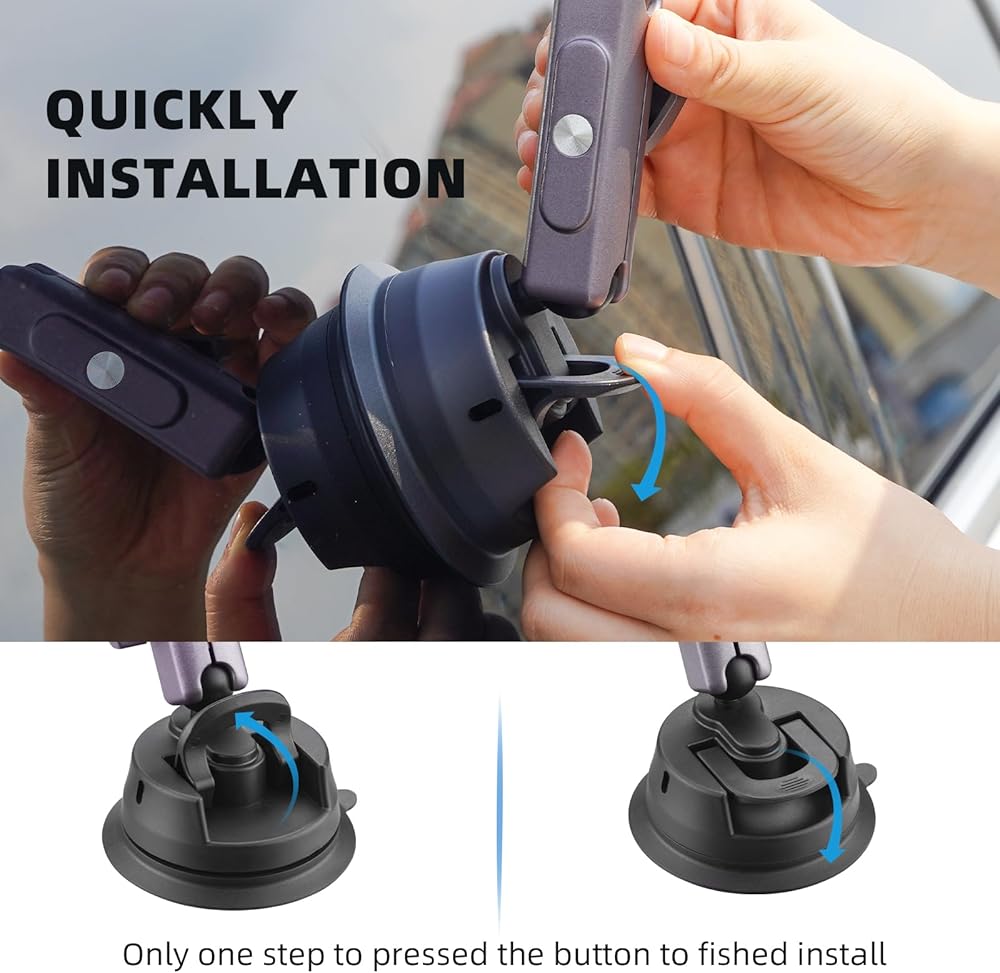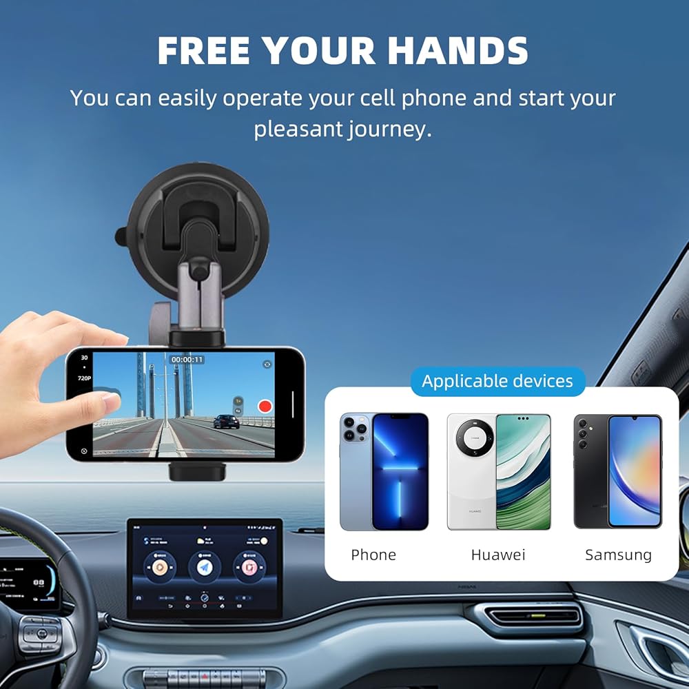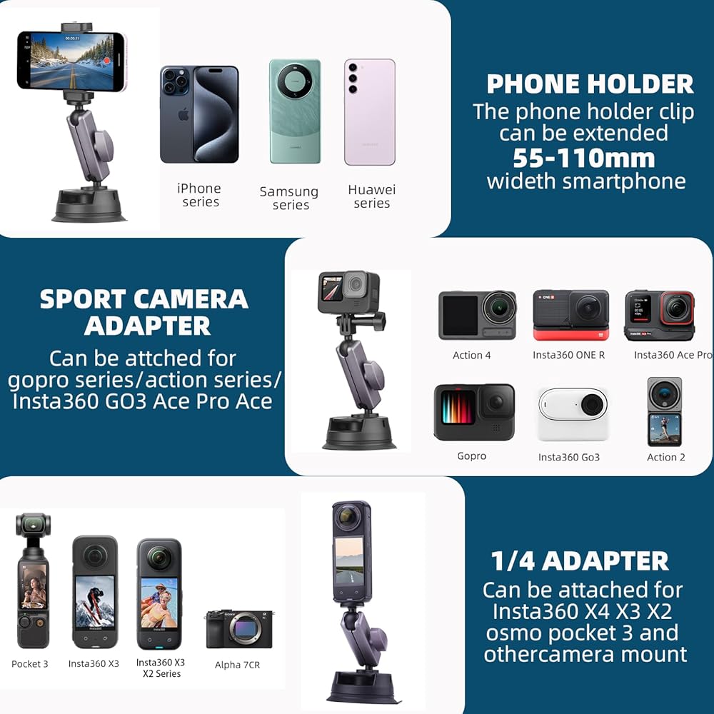توافق واسع: يتوافق حامل السيارة العالمي بالشفط مع جيب osmo 3، Insta360 ONE R RS X2 X3 X4 GO2 3 Ace Pro، GoPro Max، Go Pro Mini، Hero 12 11 10 9 8 7 5 4، Fusion Session، DJI OSMO أكشن، أكشن 2، أكشن 3 4، وأجهزة الكاميرا الرياضية الأخرى مع برغي 1/4. يمكن أن يكون مشبك الهاتف المرفق (الممتد 55-110 مم) مناسبًا لسلسلة iPhone 15 14 13 12 والهواتف الذكية Android وغيرها!