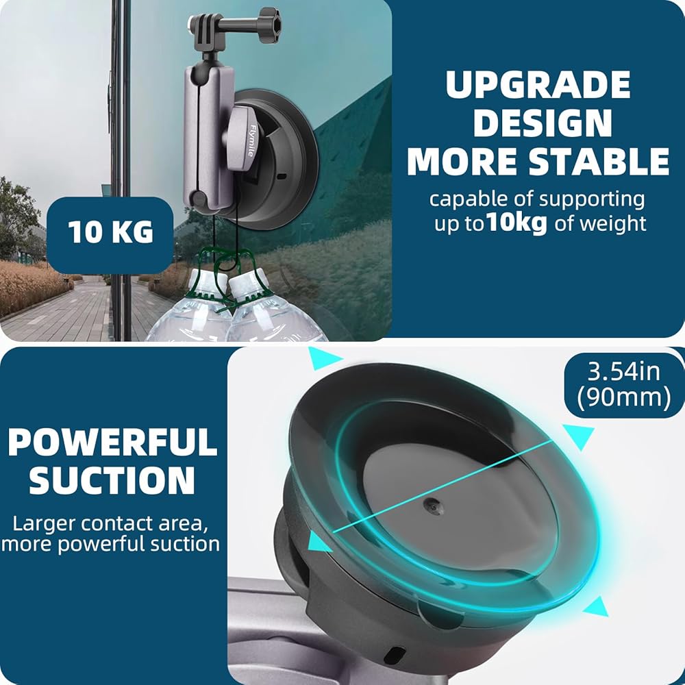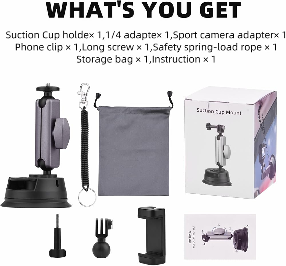 إطلاق سريع وملحقات: يتم تثبيت كوب الشفط بالضغط من أجل الامتصاص بقوة، ويسمح المقبض بتعديل اتجاه التثبيت السريع والسهل للكاميرا أو الهواتف الخاصة بك. مع حبل زنبركي الأمان لمنع سقوط الحامل، أضف أمانًا مزدوجًا إلى الكاميرا الخاصة بك. بالإضافة إلى ذلك، تتضمن قائمة العبوة حقيبة تخزين وكرة محول 1/4 وحامل هاتف.