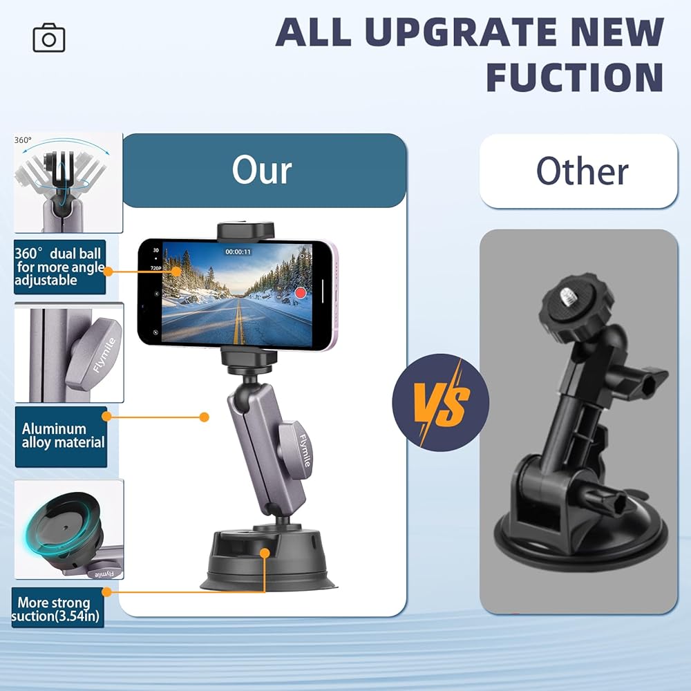 تعديل 360 درجة: تم تصميم حامل نافذة الزجاج الأمامي لتصميم رأس كروي مزدوج يمكنه تعديل زاوية 360 درجة. يمكن ضبط الزاوية وفقًا لسيناريوهات الاستخدام المختلفة واحتياجات التصوير.