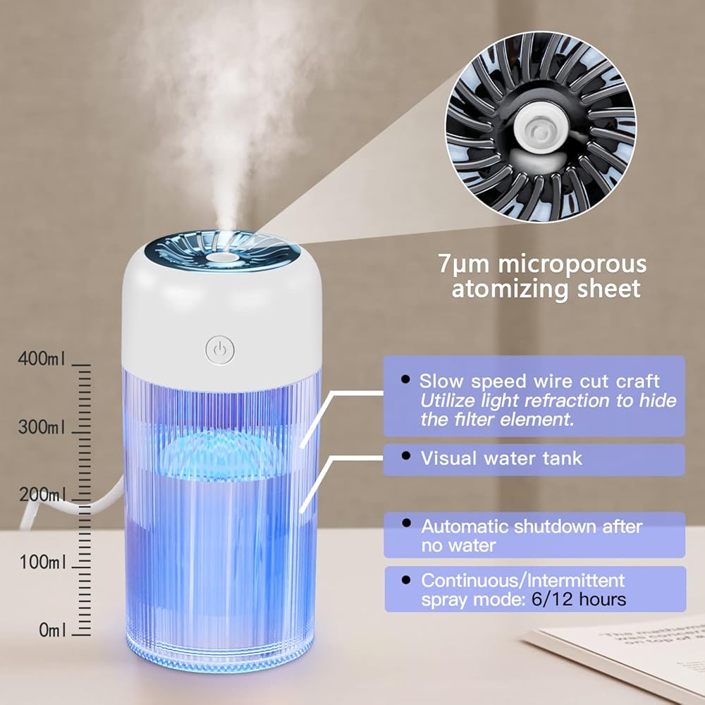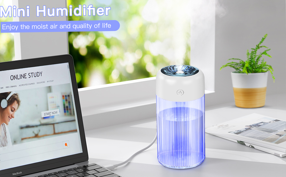 [مرطب صغير محمول] سهل التشغيل وسهل الحمل. استخدام الموجات فوق الصوتية لإنتاج العديد من البخاخات الرقيقة من الماء السائل يزيد من رطوبة الهواء ويحسن جودة الحياة بفعالية. مناسب لترطيب النباتات والسفر وغرفة النوم والسيارة والمكتب وما إلى ذلك. استخدام أقوى رقاقة لن يحجب المنفذ.