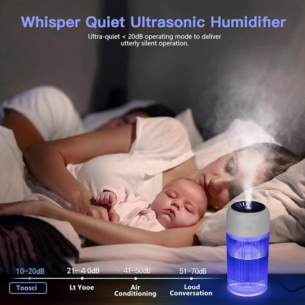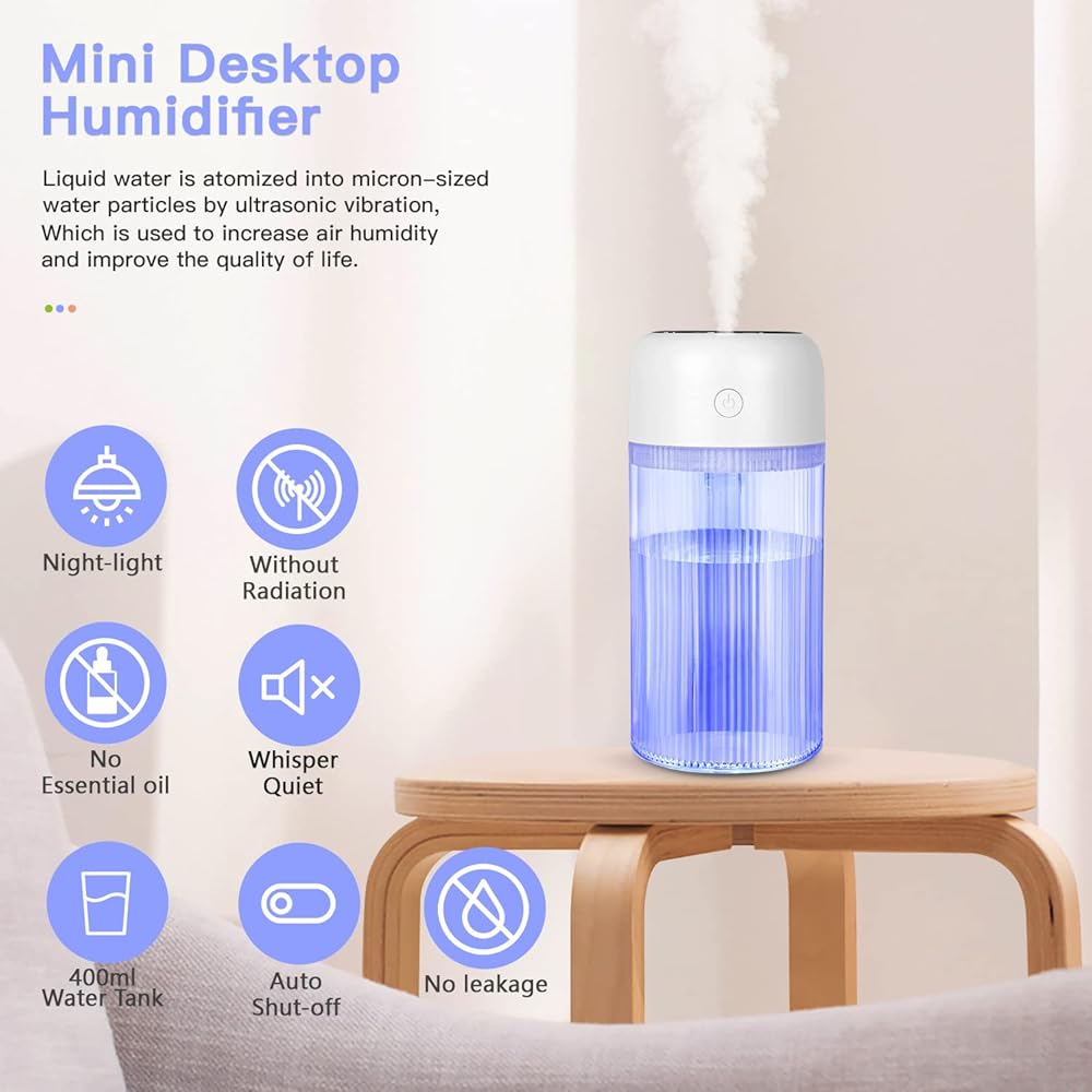 [تشغيل صامت وإضاءة ليلية] صوت تشغيل مرطب سطح المكتب أقل من 20 ديسيبل، مما لن يؤثر على النوم والعمل. يعزز الضوء الليلي جو الغرفة ويخلق بيئة مريحة بصريًا. 7 ألوان وأضواء ثابتة ووضع التنفس يمكن تعديلها وفقًا لتفضيلاتك. (الضوء الأزرق الافتراضي عند التشغيل، اضغط مع الاستمرار على المفتاح لأكثر من 3 ثوانٍ للتشغيل)