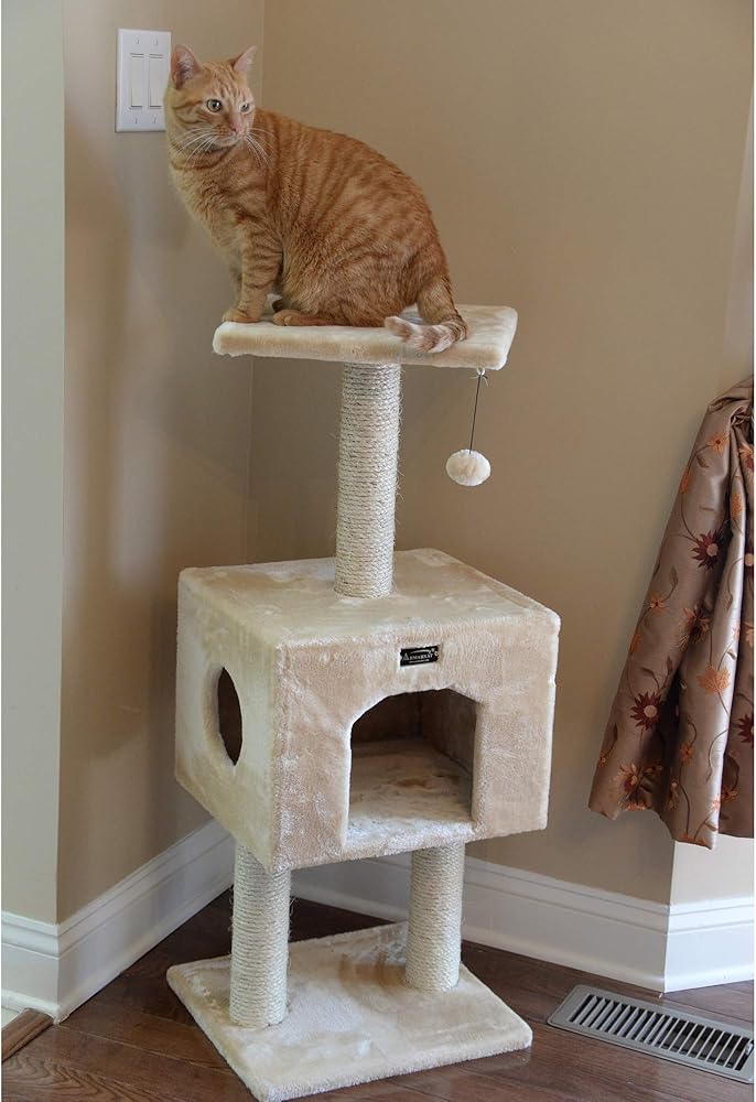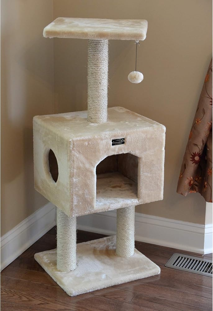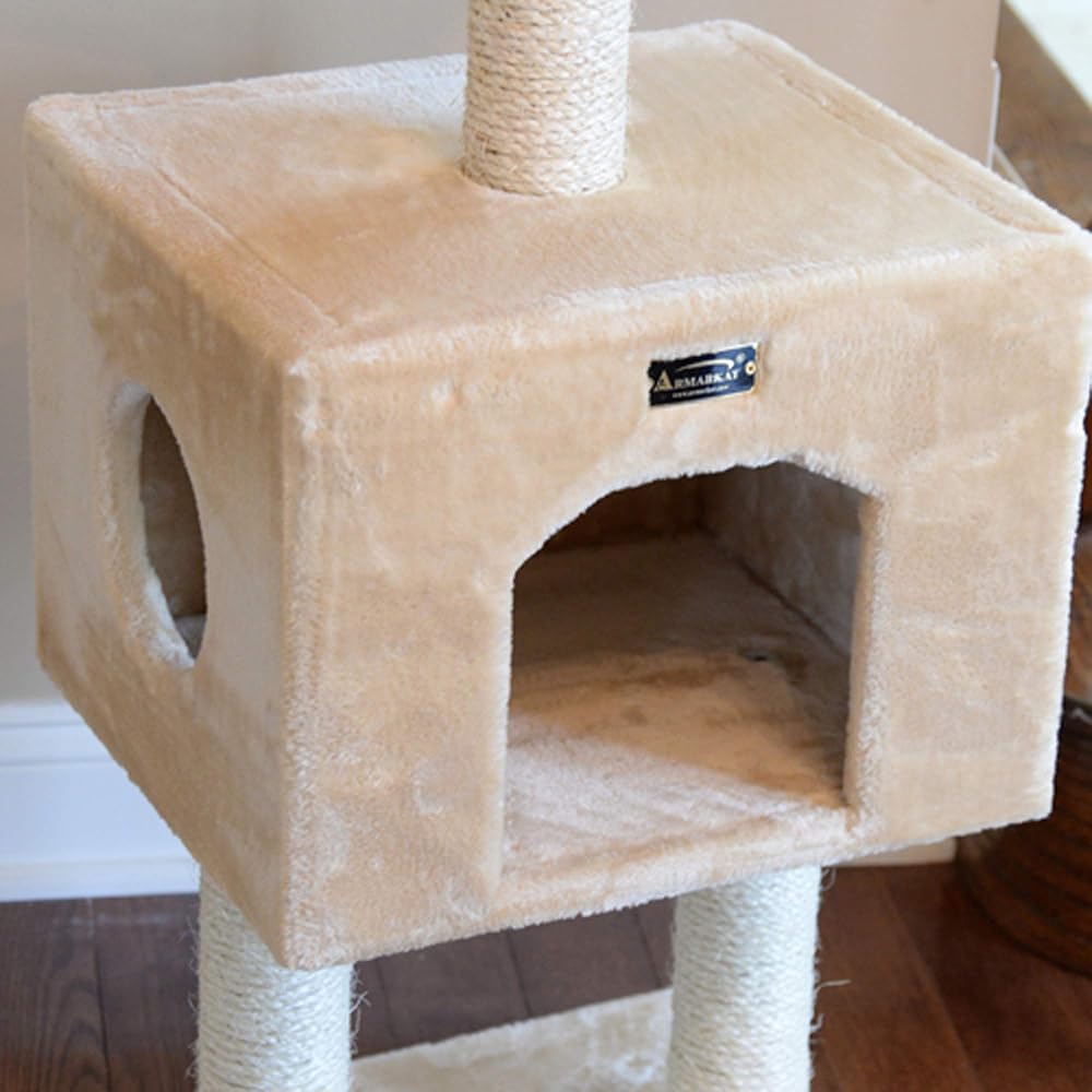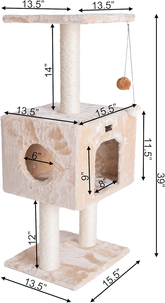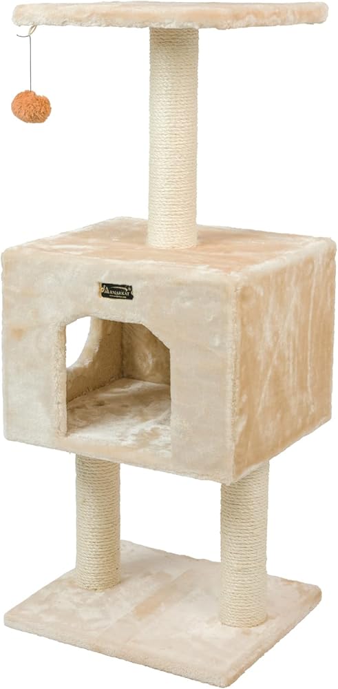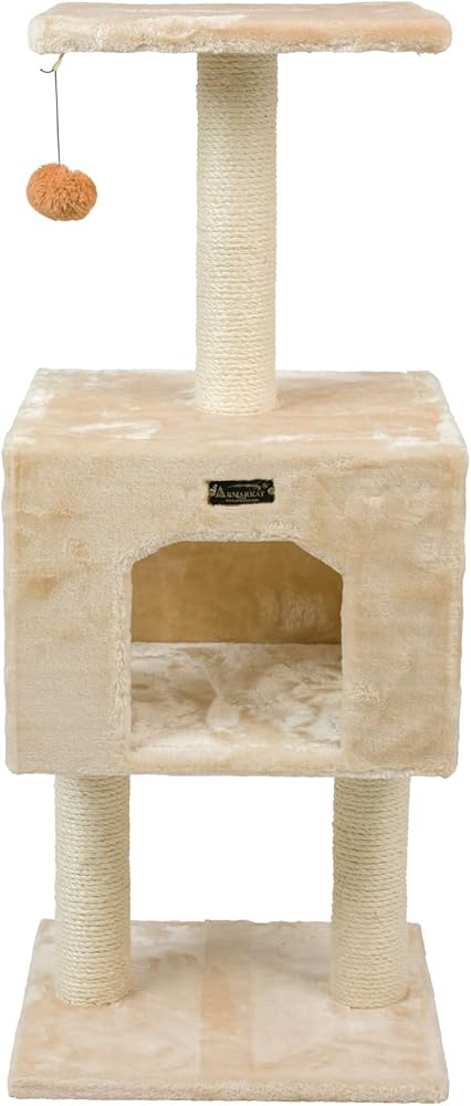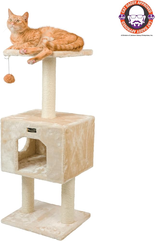 Armarkat model A4201 Classic cat tree features two levels and a roomy playhouse. This compact cat tree, available in beige, is Cat Daddy Approved by noted cat behaviorist Jackson Galaxy. F and B Bullet: Beige with high density faux fur, coverings are permanently adhered to wood structures. Well constructed of 15mm pressed wood material, making it not only thicker but stronger. 100% natural, seasoned sisal rope wraps all posts securely for years of "scratch." Dimensions: post diameter: 3"; Base: 16" x 14"; Playhouse:16"(L) x 14"(W) x 12"(H) Perch: 14" x 14" Maximum Holding Weight: 15 lbs. Six-months warranty included. Replacement parts available from manufacturer.