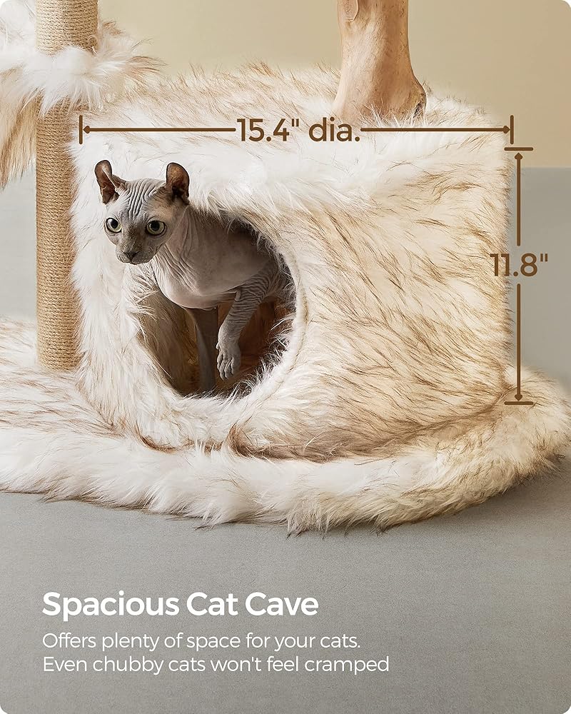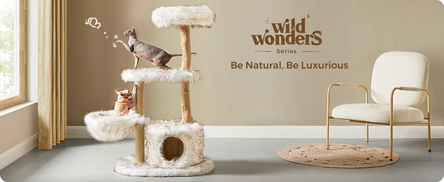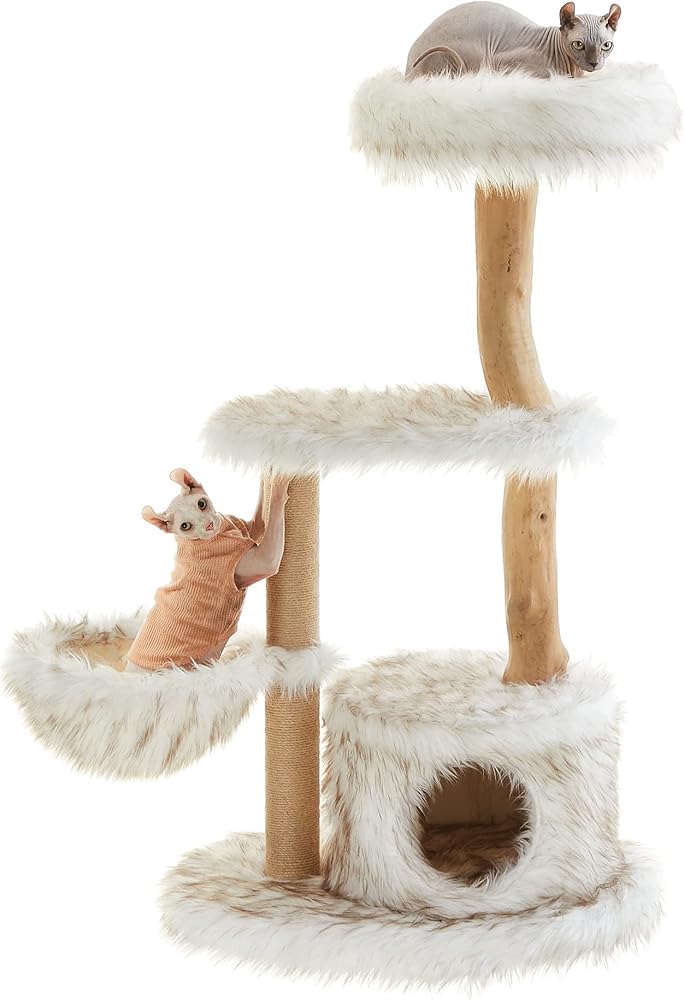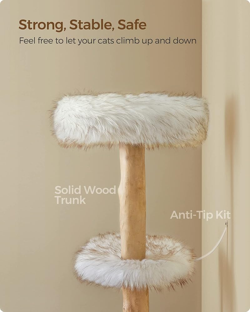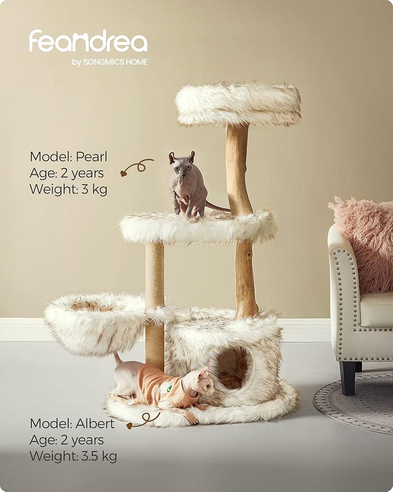 [طبيعي. فاخر. الجمالية] تجمع بين الجذع الطبيعي والقطيفة الطويلة البيضاء المتدرجة، تمتزج شجرة القطط العصرية هذه بسهولة مع منزلك الجميل وهي عمل فني فريد من نوعه يعزز مساحتك