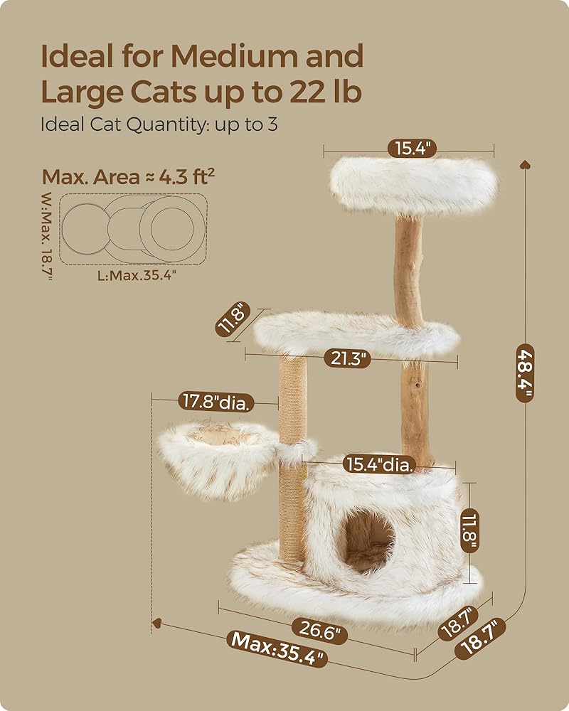 [يناسب القطط الكبيرة التي يصل وزنها إلى 22 رطلاً] المجثم العلوي (قطر 15.4 بوصة)، والسلة (قطر 13.8 بوصة)، والكهف (15.4 بوصة × 15.4 بوصة × 11.8 بوصة) لشجرة القطط هذه أكبر من تلك الشائعة، لذا حتى القطط الكبيرة لديها مساحة كافية للاسترخاء والتحرك