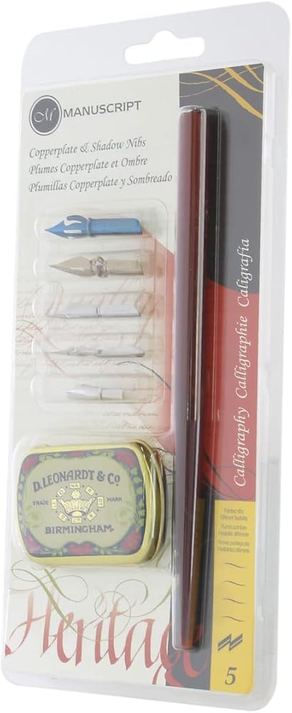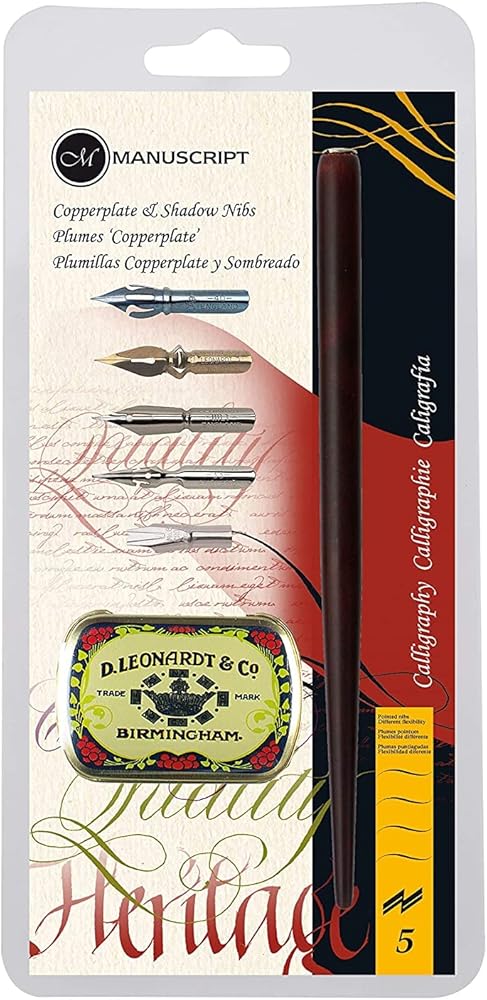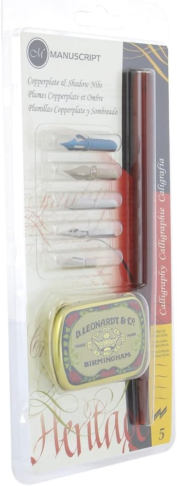 This specialized copperplate and shadow dip pen calligraphy set includes a wooden pen holder, a selection of five different dip pen nibs and a reproduction Victorian storage tin for nibs and reservoirs. The perfect gift set for friends and family who like to get creative with correspondence, scrapbooking and paper crafts. It includes a crown nib, a point nib, a shorthand nib, a scroll 6 nib and a copying nib.