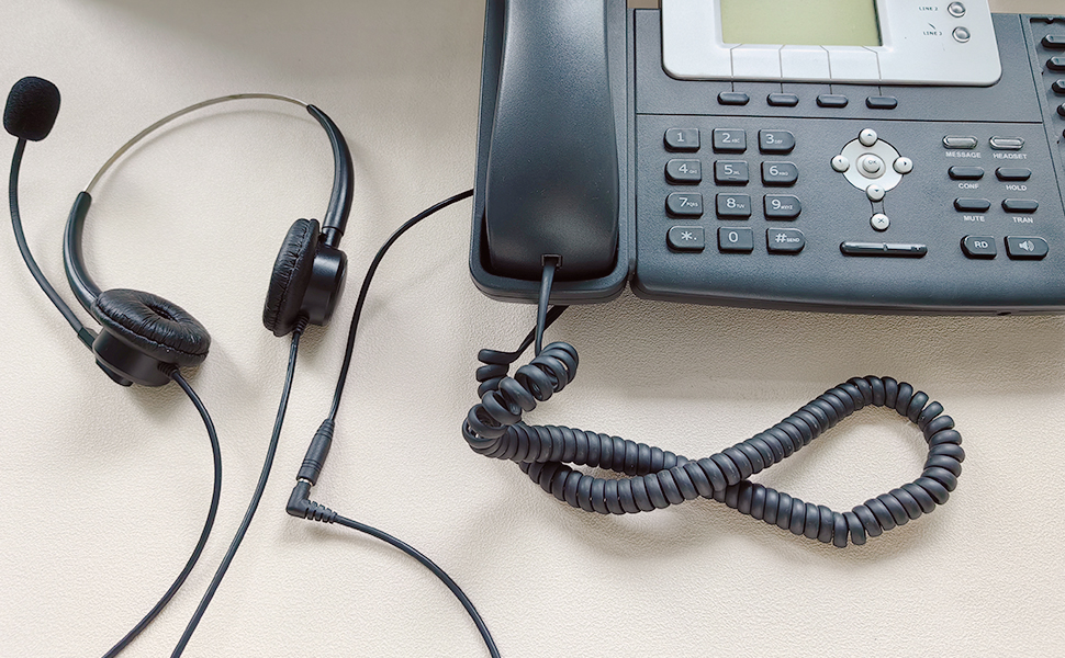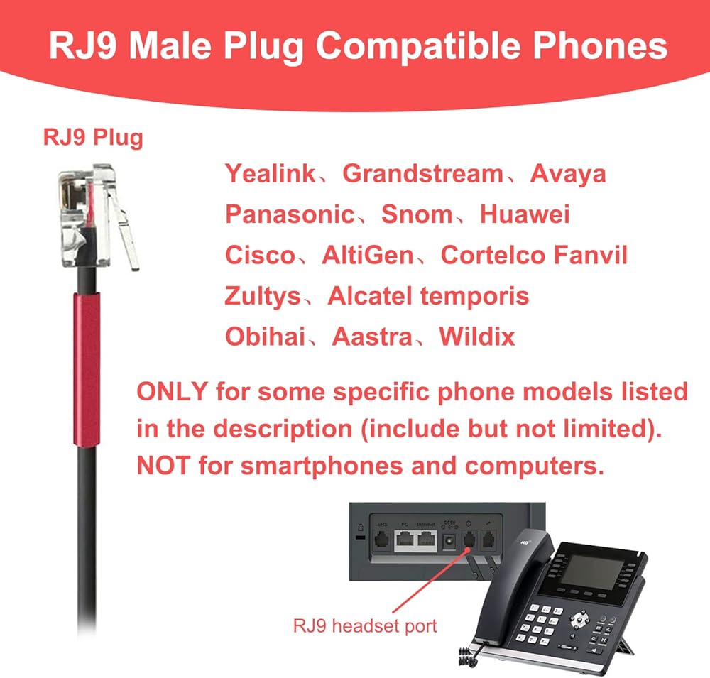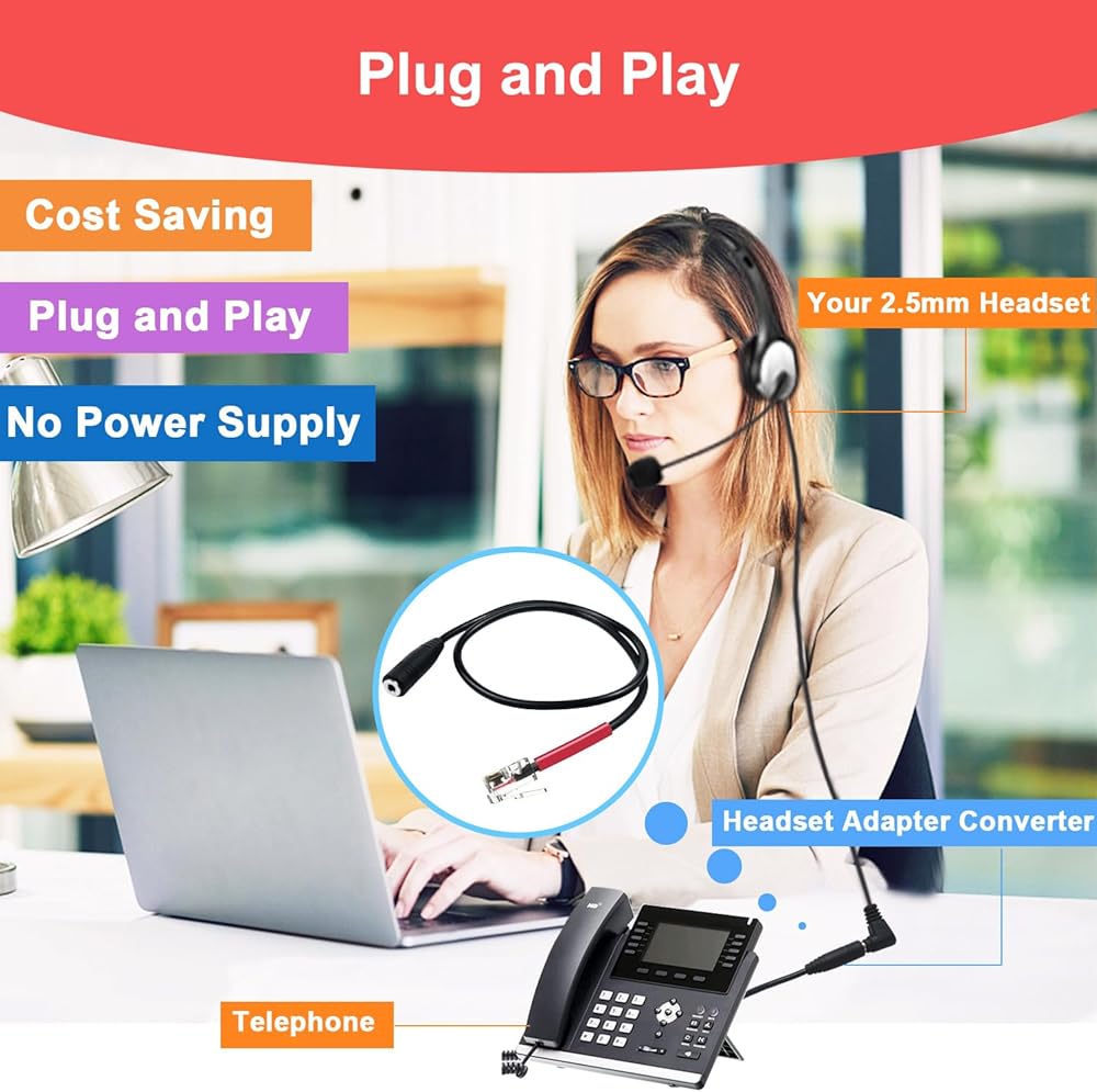 【التوصيل والتشغيل】: قم بتوصيل سماعة الرأس مقاس 2.5 مم بمقبس أنثى مقاس 2.5 مم، ثم قم بتوصيل مقبس ذكر 4P4C RJ9 بمنفذ سماعة الرأس أو سماعة الهاتف على الهاتف الأرضي بمكتبك. وبعد ذلك تصبح جاهزًا لإجراء/استقبال المكالمات الهاتفية على هواتف IP الخاصة بك باستخدام سماعة الرأس القياسية مقاس 2.5 مم.