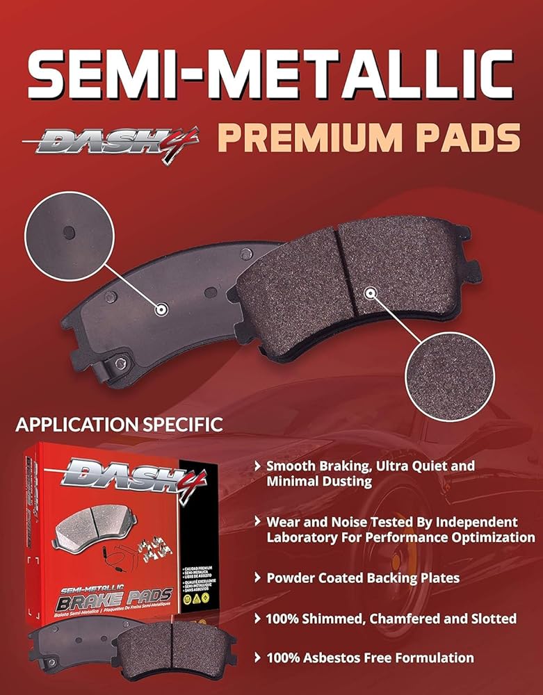 Welcome to Dash 4, where we redefine braking excellence with our premium brake solutions. With over 40 years of industry expertise, we have been at the forefront of delivering top-notch brake performance. Engineered to deliver unparalleled performance and durability, our brake pads, rotors, and kits are the epitome of quality craftsmanship.At Dash 4, we understand the importance of selecting the right brake pad material for optimal performance. That's why we've streamlined the decision-making process, offering a comprehensive range of options tailored to diverse driving styles, vehicle types, and budgets. Trusted by professional mechanics nationwide, Dash 4 provides ideal brake replacements for over 98% of vehicles on the road today. Our commitment to excellence extends to every aspect of our products. Each brake pad undergoes meticulous engineering and testing, ensuring peak performance, exceptional longevity, and the elimination of noise and dust concerns. Our in-house friction materials lab enables our engineers to innovate swiftly, crafting cutting-edge brake friction products that set industry standards. Dash 4 shines with a proprietary ceramic formulation, free from asbestos and designed to minimize dust while providing exceptional fade resistance. Carefully crafted shims guarantee noise-free braking, solidifying Dash 4 as the ultimate choice for brake pad replacements. Whether you're navigating the track in a sports vehicle or embarking on off-road adventures in a truck, Dash 4 Brakes deliver top-tier braking performance you can rely on. Experience the difference with Dash 4, quality you can trust.