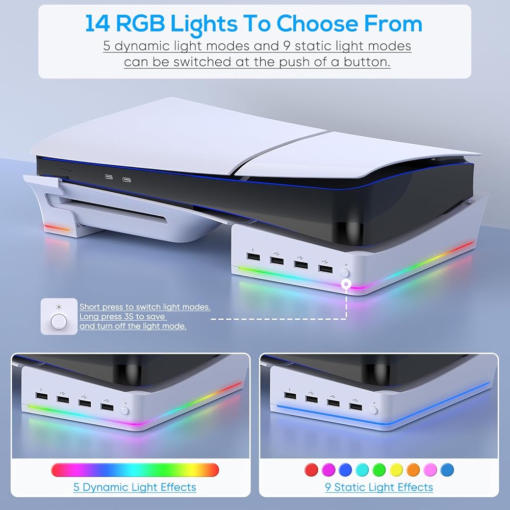 🌀【أروع أوضاع إضاءة RGB ذات 14 لونًا】حامل الحامل لجهاز PS5 Slim مع شريط إضاءة RGB فريد من نوعه. يحتوي شريط الضوء على 14 نوعًا من تأثيرات تغيير الألوان، والتي تنقسم إلى إضاءة ثابتة وديناميكية. مع زر مستقل، يمكن التغيير أو التشغيل/الإيقاف، لا تقلق بشأن تشتيت انتباهك. يمكنك أيضًا ضبط جو الإضاءة وفقًا لتفضيلاتك.