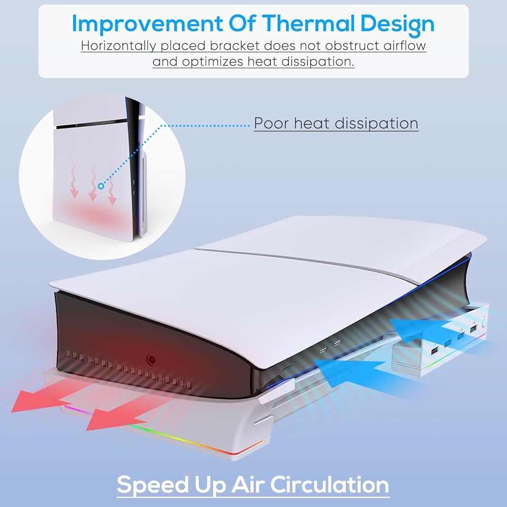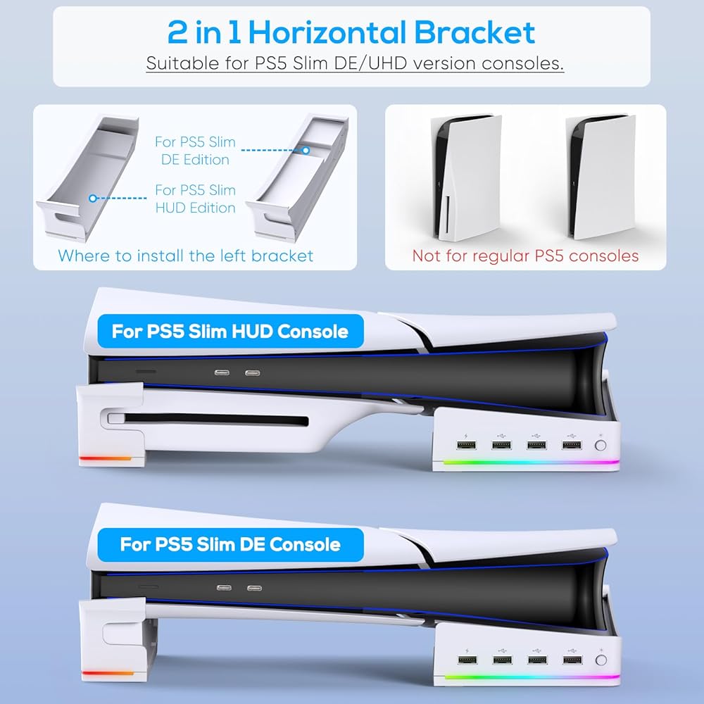 🌀 【حامل أفقي مطور لوحدة تحكم PS5 SLIM 】يتوافق حامل FASTSNAIL مع قرص PlayStation 5 النحيف الجديد لعام 2023 ووحدة التحكم بالإصدار الرقمي. يأتي مع 4 منافذ توسيع USB لاحتياجات الشحن ونقل البيانات؛ التصميم الأفقي أكثر استقرارًا من الحامل الرأسي الأصلي. توفير المساحات مع زيادة مساحة التبريد لتسريع تبديد الحرارة؛ المزيد من الأضواء القابلة للتعديل ذات 14 لونًا يمكن أن تجعلك تستمتع ببيئة اللعبة بشكل أفضل! ✭ ملاحظة: فقط لوحدة التحكم PS5 Slim، وليس للكبار.