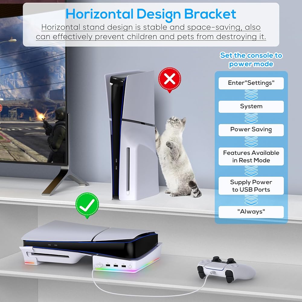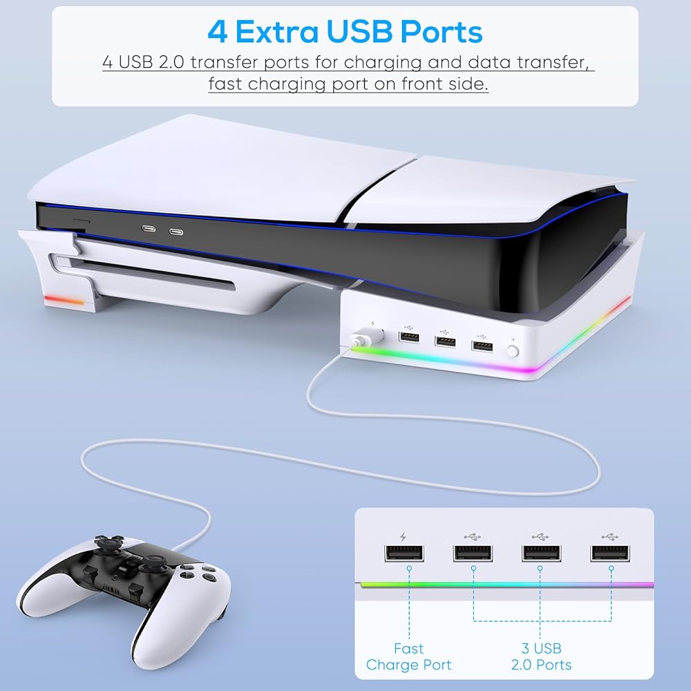 🌀【منافذ توسيع USB إضافية 4 × 】قم بتحويل أحد منافذ USB لوحدة التحكم الخاصة بك إلى أربعة مع حامل لجهاز PS 5 Slim عبر نقل البيانات والشحن، مع توافق واسع بما في ذلك وحدات تحكم PS5 DualSense/Edge، وكابل USB، والقرص الصلب، والماوس، ولوحة المفاتيح. والهواتف المحمولة أو الأجهزة اللوحية، وما إلى ذلك. 📌ملاحظة: يرجى إدخال كابل USB المرفق في منفذ USB الخلفي لوحدة التحكم PS5 Slim الجديدة وضبط مصدر وضع الطاقة المستمر للحصول على الطاقة.