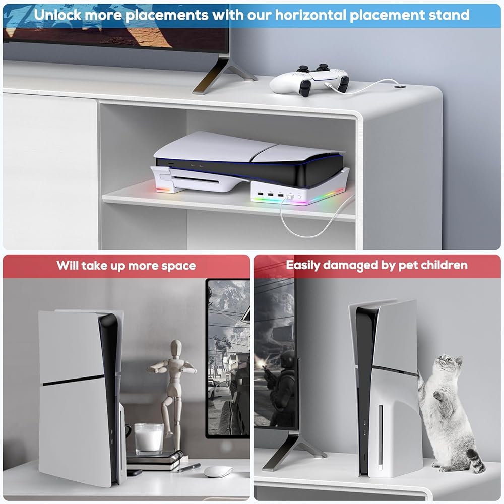 حامل أفقي مع ضوء RGB LED لوحدة التحكم PS5 Slim الجديدة، وملحقات حامل الحامل مع 14 وضع إضاءة و4 منافذ USB، وقاعدة غير قابلة للانزلاق لقرص Playstation 5 النحيف والإصدار الرقمي