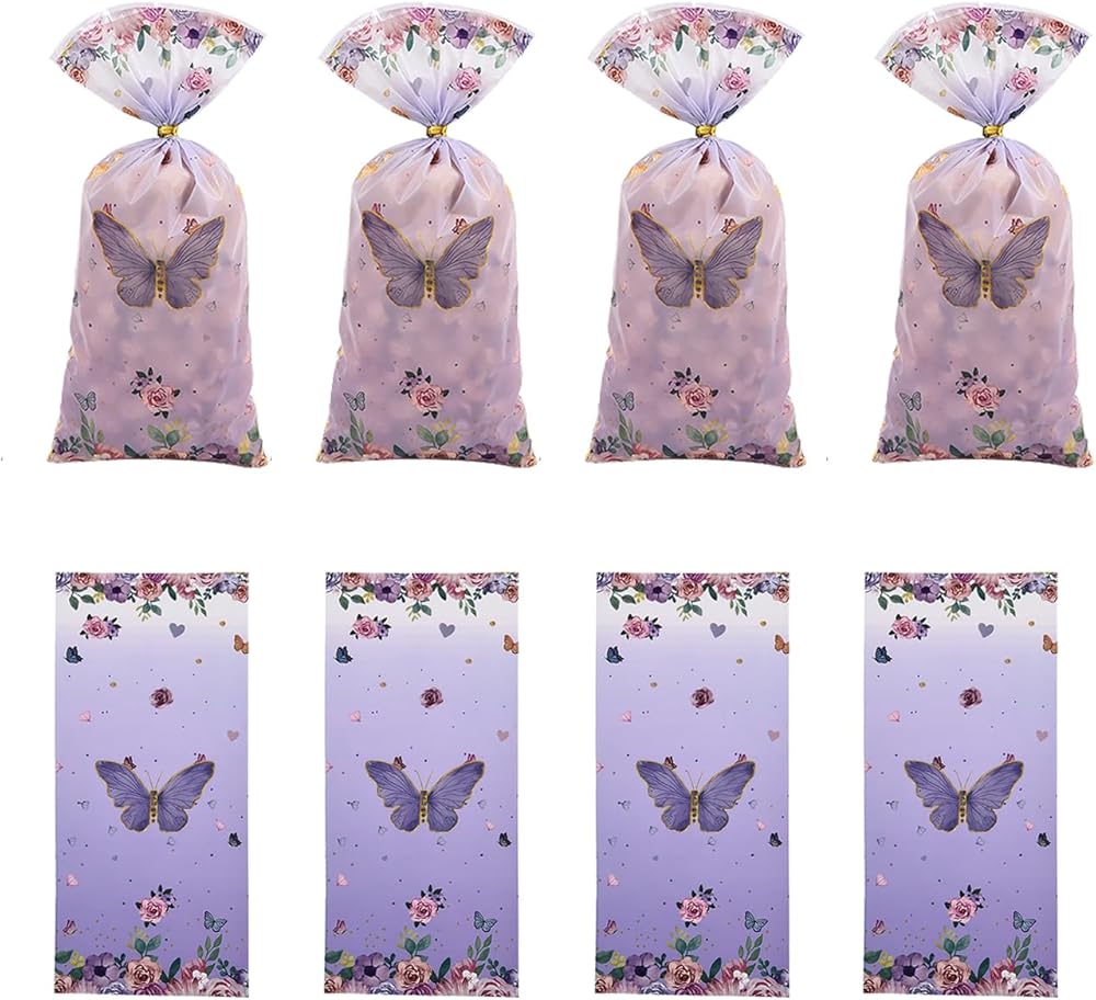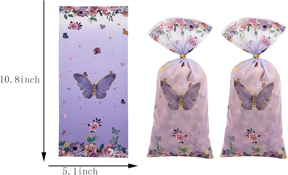 ما تحصل عليه: 50 قطعة من أكياس حلوى السيلوفان على شكل فراشات أرجوانية.