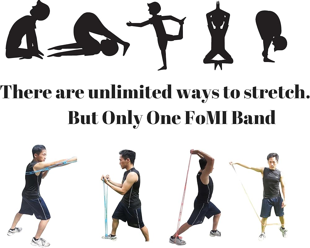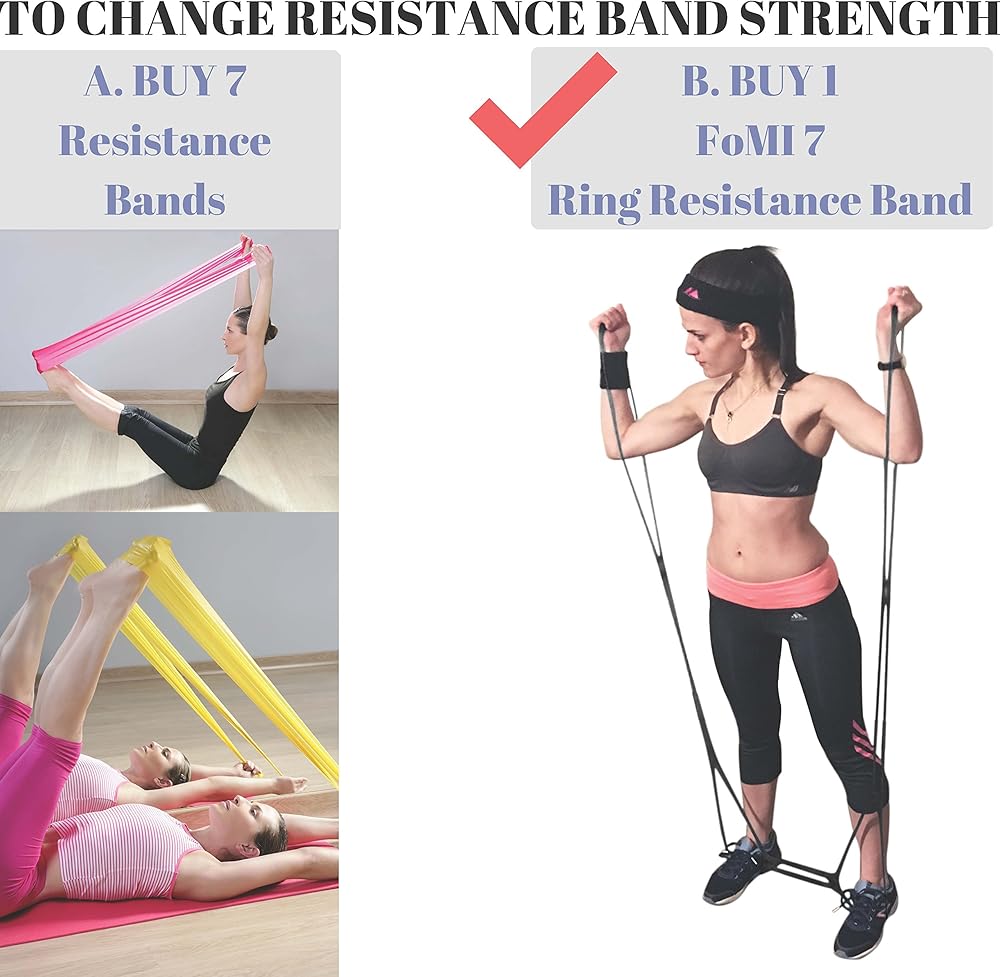 Bring your Gym Home with FoMi's Seven Ring Resistance Bands. With the GUARANTEED highest quality professional grade workout material and premium quality stretching. FoMI brings the top choice in exercise bands for personal trainers to your door. Don't make the mistake of purchasing a low quality product that will discourage you from hitting your goals. FoMI products will last you a lifetime, these will be the last resistance band that you ever need to buy. Simply choose a resistance you want by choosing a band grip. Secured your grip in a way so the length is appropriate to give resistance. Resistance bands are a great way to help achieve your goals when the gym is hard to get to. From early morning workouts to a quick vacation set, The FoMI resistance bands will be there when you need it. The FoMI Difference: Highest Quality 100% Premium Gym Quality, Comfort Handle, Adjustable 7 Ring band. 7 RINGS, INFINITE STRETCHES.