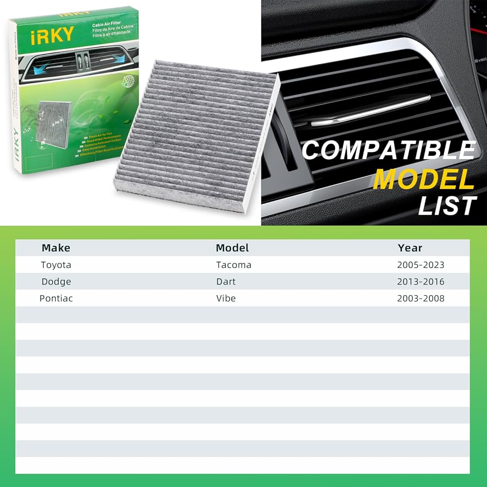 التوافق: مرشح الهواء المقصورة متوافق مع Dodge: Dart 2013-2016/Pontiac: Vibe 2003-2008/Toyota: Tacoma 2005-2023.