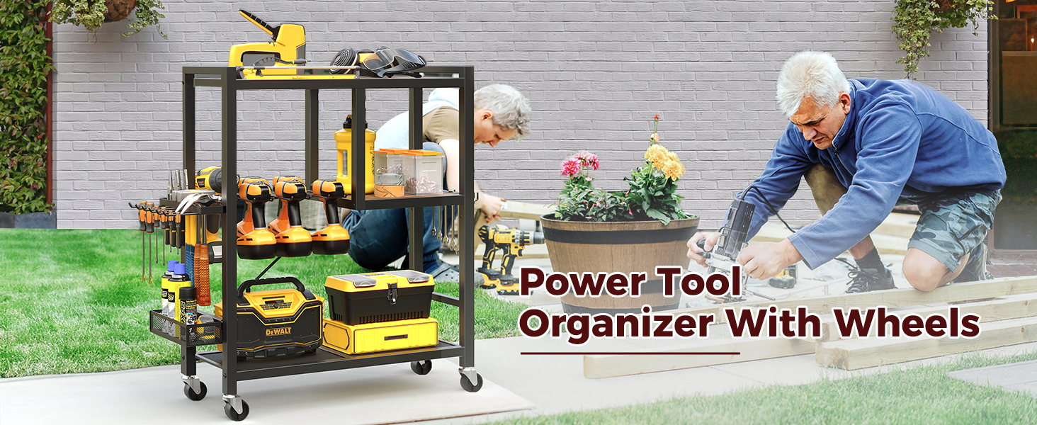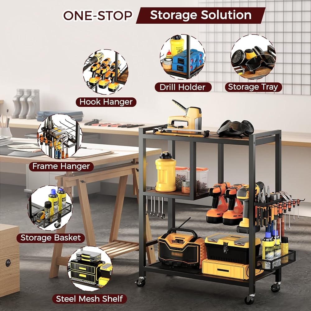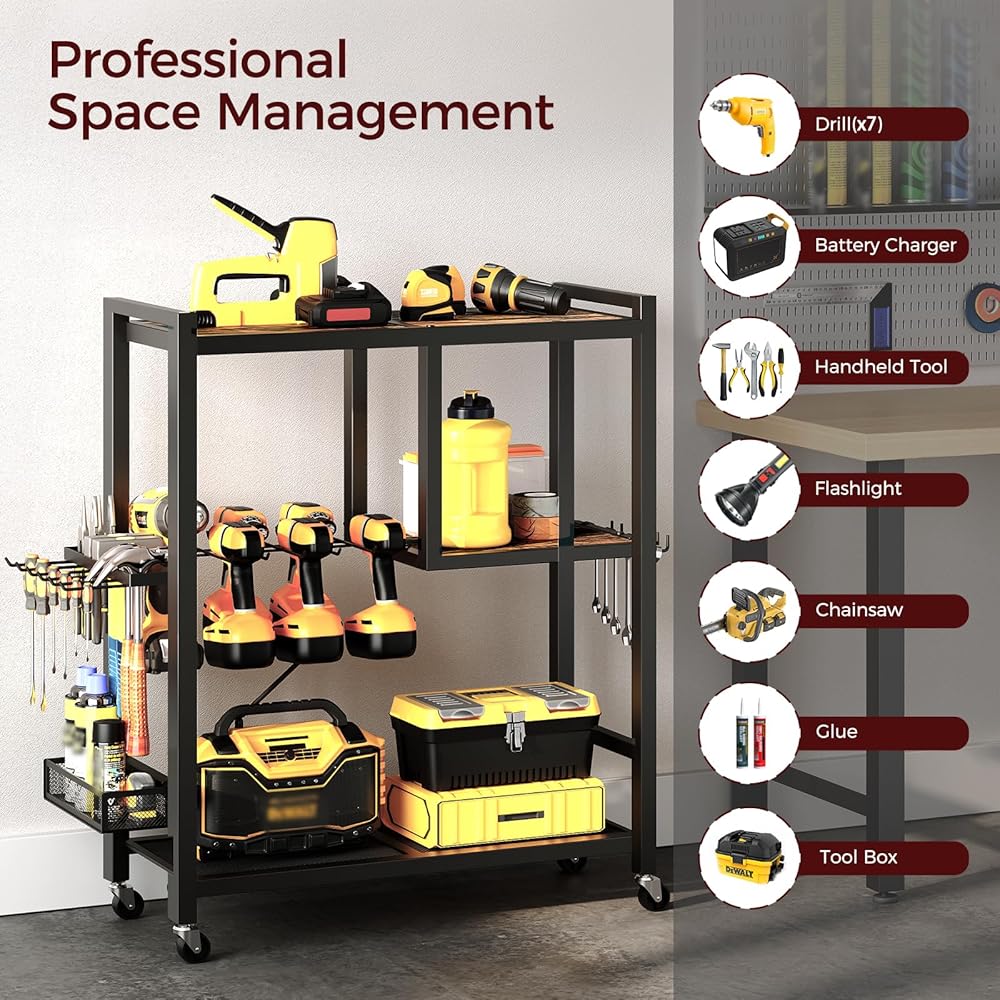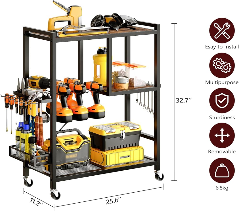 تخزين مرآب أدوات أدوات الطاقة: هذه عربة منظم الأدوات 25.6 "L x 11.2" W × 32.7 "H تأتي مع أرفف خشبية وحاملي الحفر وجرف شبكة وشماعات الخطاف وشماعات الإطار وسلة تخزين لمختلف الأدوات والملحقات ، وضمان تعظيم استخدام المساحة