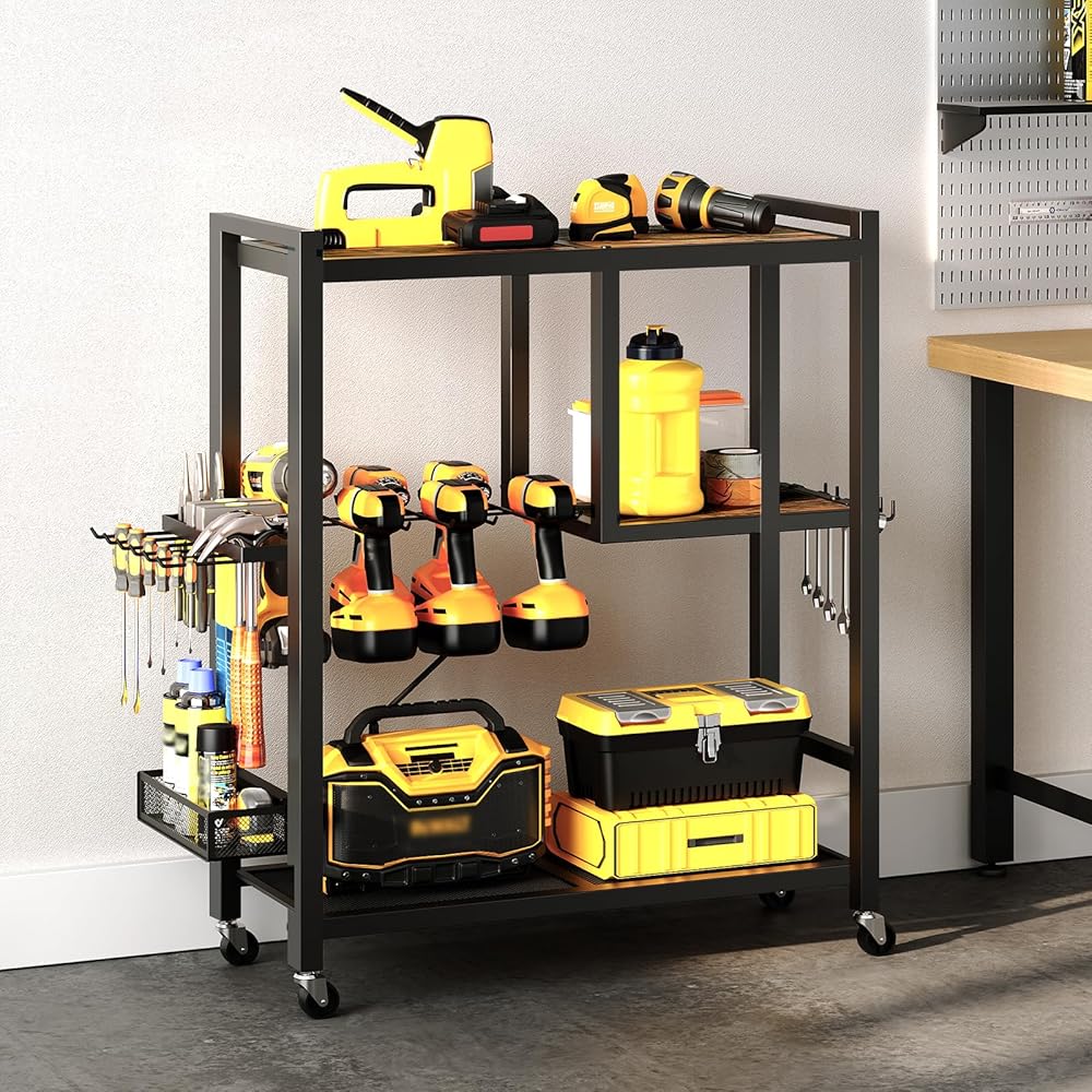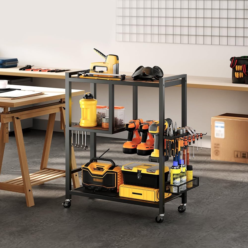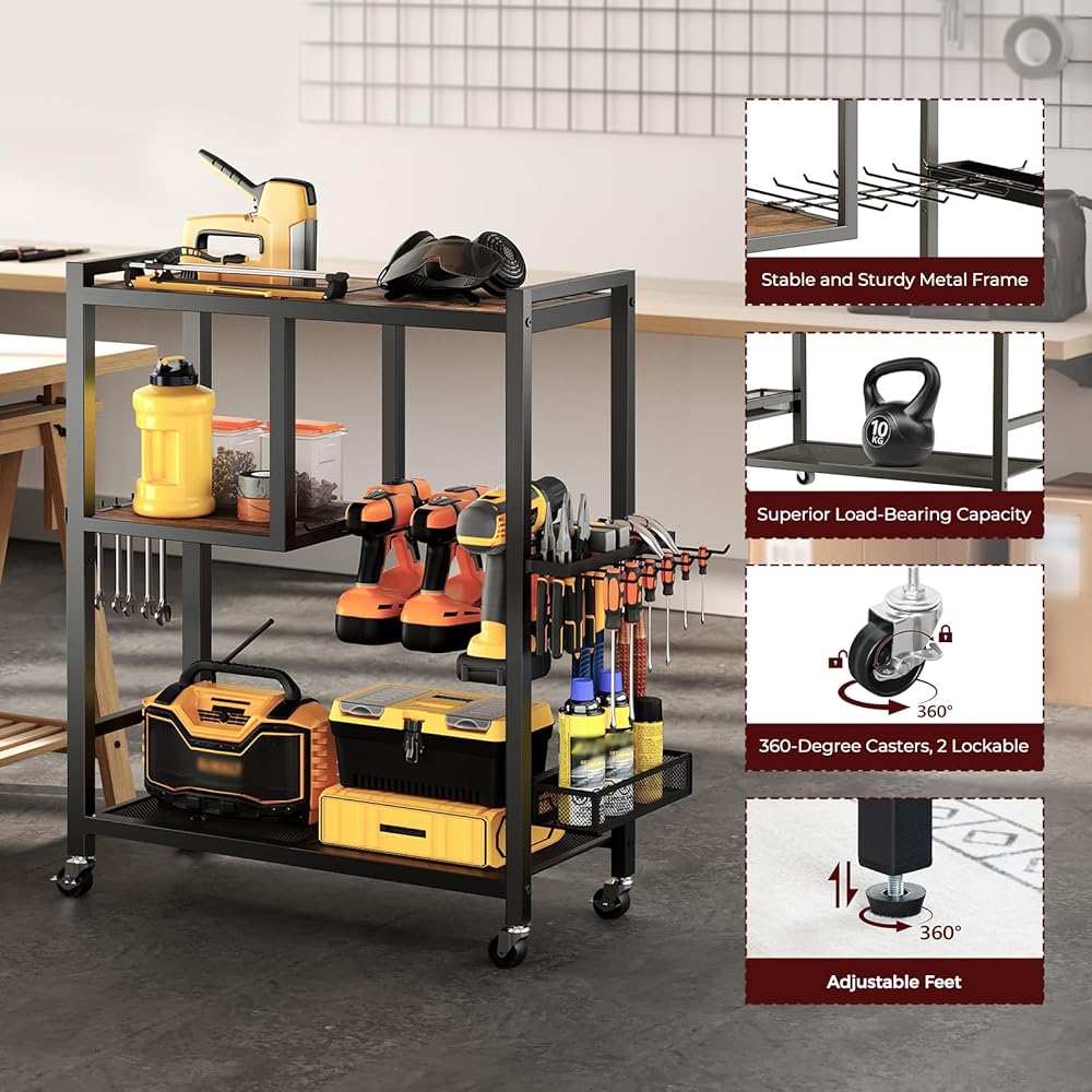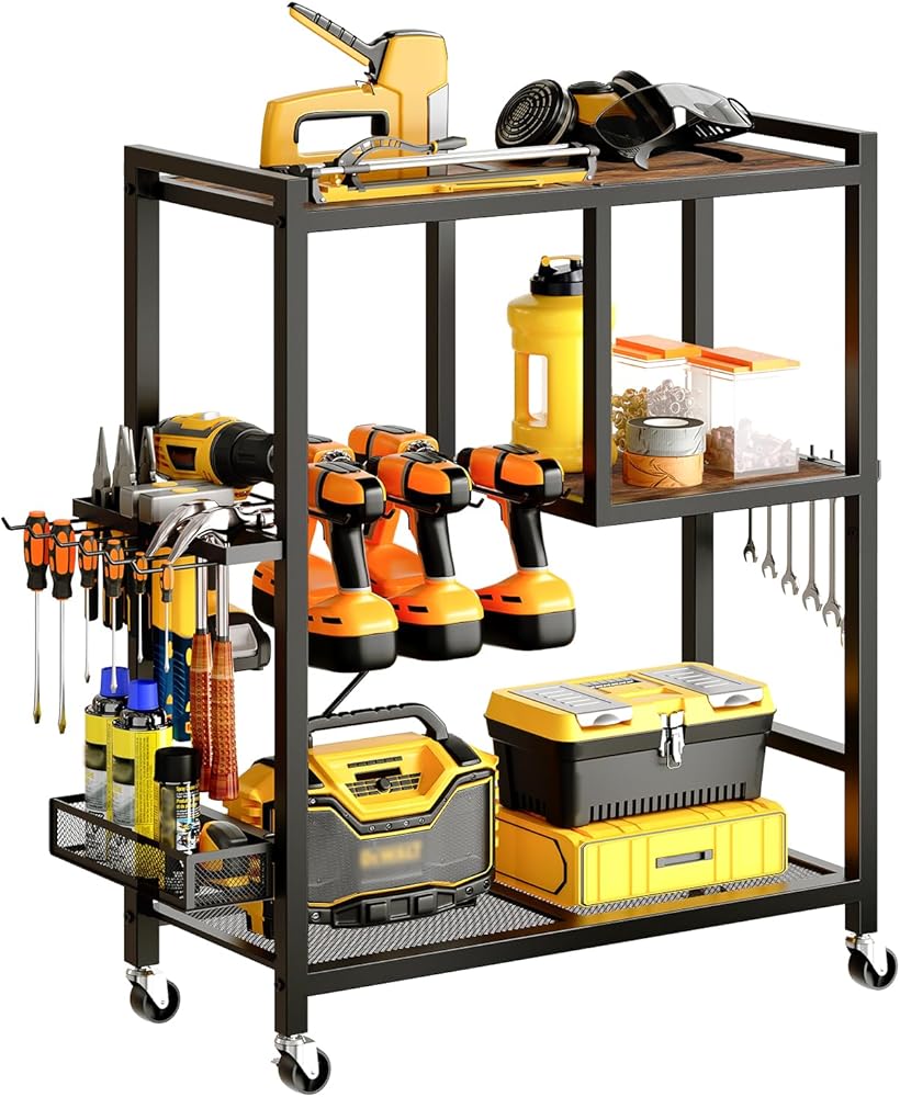 تخزين مرآب أدوات أدوات الطاقة: هذه عربة منظم الأدوات 25.6 "L x 11.2" W × 32.7 "H تأتي مع أرفف خشبية وحاملي الحفر وجرف شبكة وشماعات الخطاف وشماعات الإطار وسلة تخزين لمختلف الأدوات والملحقات ، وضمان تعظيم استخدام المساحة