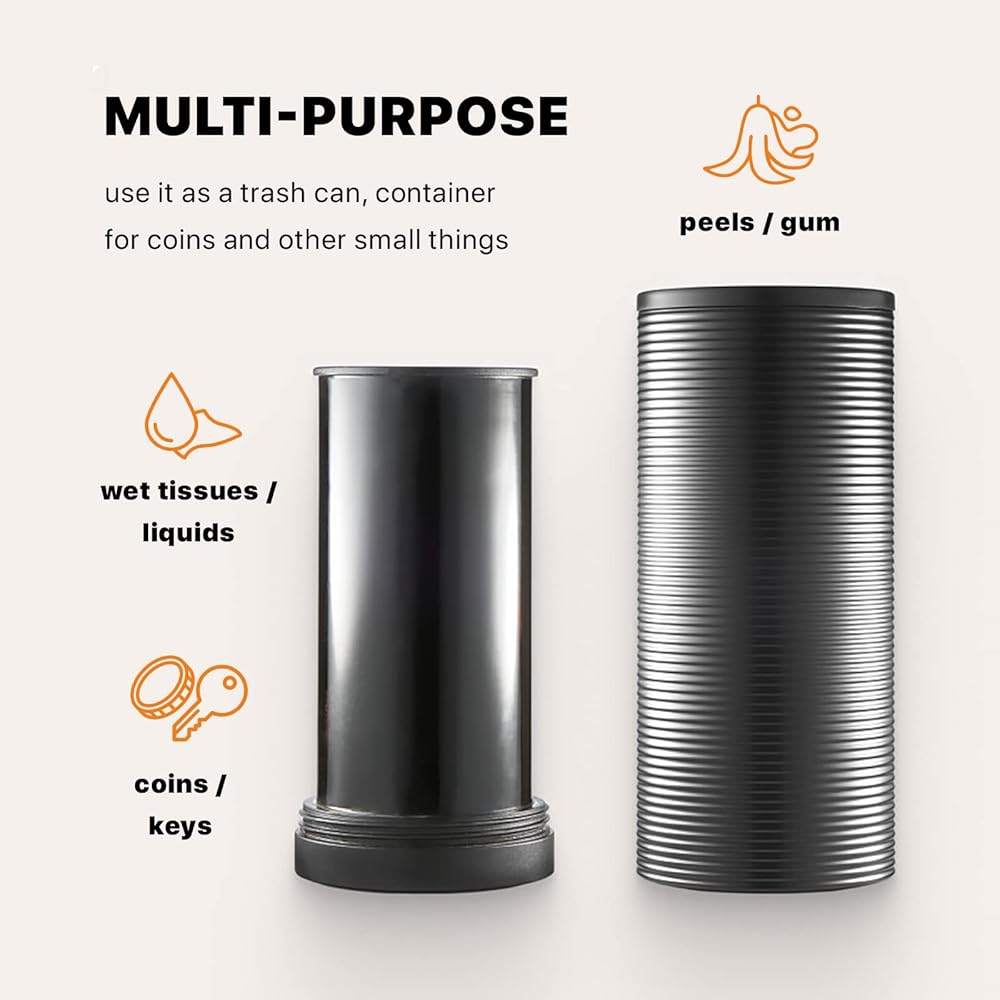 CONVENIENT & CUTE DESIGN: easy one-touch lid design and minimalist aluminum alloy body make this small trash can for your car to be used as a portable coin holder.
