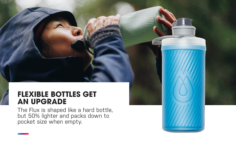Flexible bottles get an upgrade. The Flux is shaped like a hard bottle, compresses like a softflask, and cuts weight by 50%. Topped with a dust cover and twist-drink nozzle for grab-and-go hydration, plus a bail handle to keep hydration secure in your hand or on your pack. The Flux stands upright like a hard bottle but when you finish your drink, this bottle packs down to pocket size. Weights and Dims Flux 1L Capacity: 1L / 32 fl oz Weight: 102 g / 3.6 oz Dimensions: 230 mm x 90 mm / 9.1 in x 3.5 in