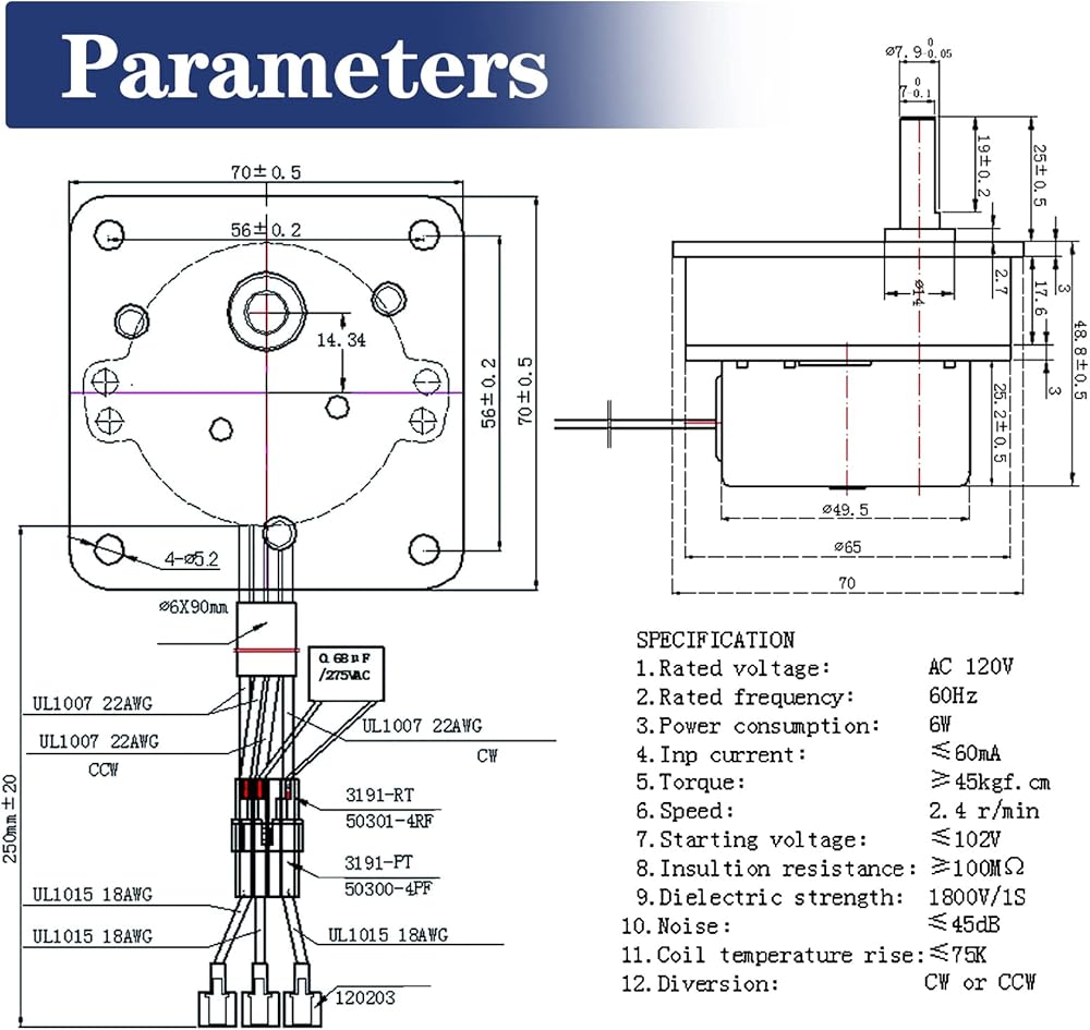 • المواصفات: محرك تغذية المثقاب هو 6 وات، 2/2.4 دورة في الدقيقة، 120 فولت، ويشتمل الطرد على قطعة من المحرك، وأذرع تثبيت وقطعة من محول سلك تجاوز المكثف.