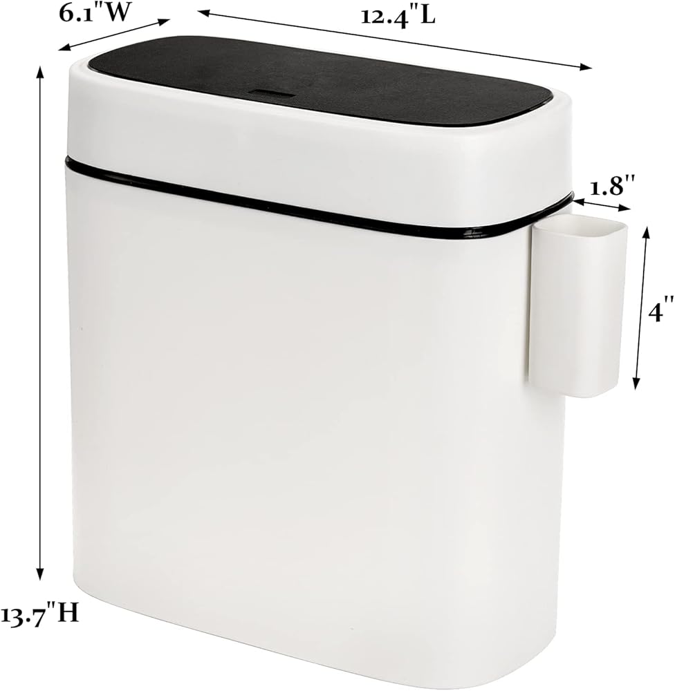 الحجم والسعة: يبلغ مقاس سلة مهملات الحمام هذه 12.4 بوصة طول × 6.1 بوصة عرض × 13.7 بوصة ارتفاع، مع سعة كبيرة تبلغ 14 لتر/3.7 جالون. مقاس حامل أكياس القمامة 1.8 بوصة طول × 1.8 بوصة عرض × 3.9 بوصة ارتفاع .