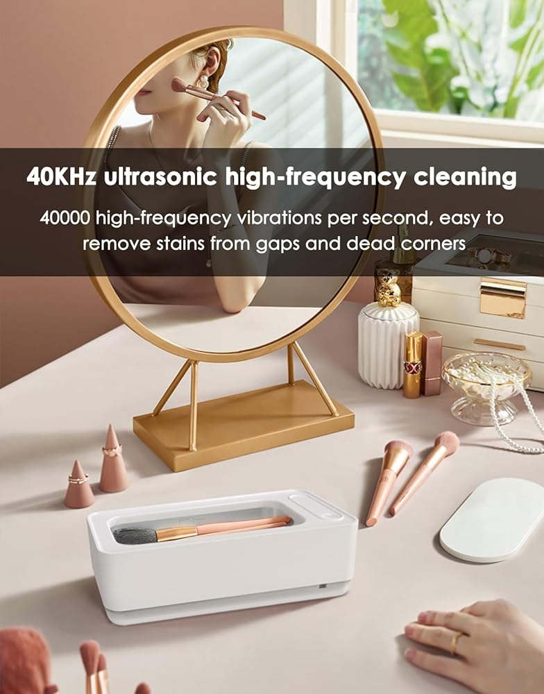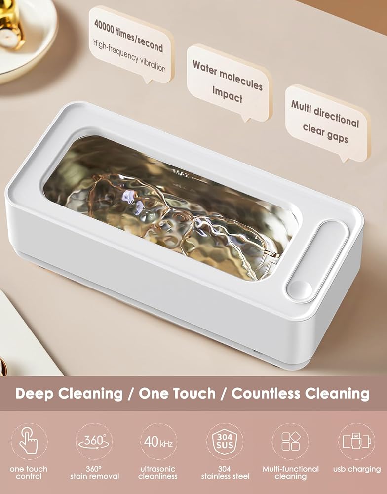 تنظيف فعال وقوي - يوفر المنظف بالموجات فوق الصوتية ترددًا يصل إلى 40.000 هرتز، تنظيف شامل بزاوية 360 درجة - يتم إنشاء ملايين من فقاعات التنظيف الصغيرة أثناء عملية التنظيف، والتي يمكنها مهاجمة وإزالة البقع الأكثر عنادًا لتحقيق تنظيف قوي ولطيف. . قم بإزالة الأوساخ المخفية والأوساخ البروتينية بعمق، وتلك الملتصقة بأجزاء صغيرة، والشقوق التي لا يمكن إزالتها بشكل طبيعي عن طريق الماء.