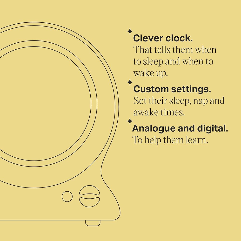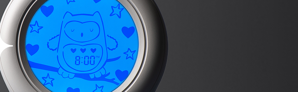 Simply set the time you would like your child to wake up in the morning and this sleep trainer clock will show the passing of time using colors and symbols. When it's time to sleep, the blue clock face features a sleepy Ollie the Owl surrounded by hearts and stars. As the time passes and reaches your pre-set wake-up time, the stars start to gradually disappear until there are only hearts left and our lovable Ollie the Owl appears awake on a yellow background. With two time setting options, you can choose to set different weekday, weekend or naptime wake-up times.