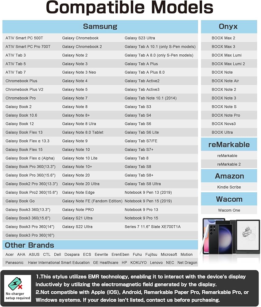 🖊️(توافق واسع): تم تصميم قلم EMR الخاص بنا ليكون متوافقًا مع مجموعة واسعة من أجهزة EMR والأجهزة اللوحية، بما في ذلك Remarkable 2، وأجهزة Samsung اللوحية، وأجهزة Wacom. (يرجى التحقق من قائمة الصور قبل الشراء.)