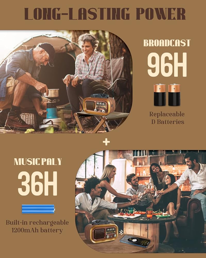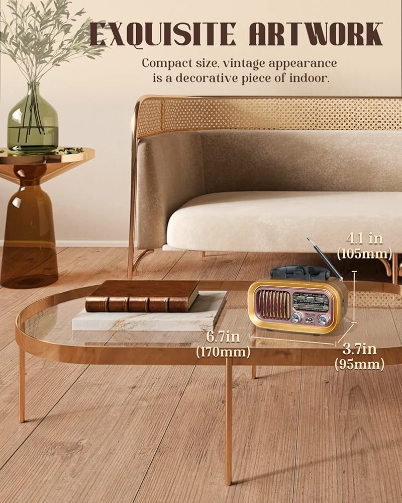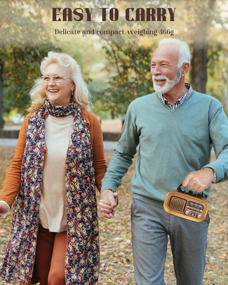 【𝐏𝐨𝐫𝐭𝐚𝐛𝐥𝐞 𝐚𝐧𝐝 𝐒𝐢𝐦𝐩𝐥𝐞】 يبلغ قياس الراديو المحمول 6.7*4.1*3.7 بوصة ويزن 450 جرامًا فقط. بفضل المقبض المحمول، يعد هذا الراديو ذو الطراز العتيق جيدًا للذهاب إلى أي مكان وفي أي وقت. ماذا عن المشي في الحديقة؟ يعد قرص الموالف القديم الموجود على الراديو القديم أكثر سهولة من الواجهة الرقمية، وسهل الاستخدام للغاية. وعلى بعد خطوتين فقط للوصول إلى المحطات، وهو مناسب تمامًا لكبار السن. إنها واحدة من أفضل اختيارات الهدايا للآباء، أليس كذلك؟