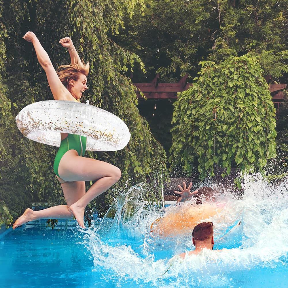 These glitter water tubes are helpful and dependable swimming accessories for beginners, also perfect for summer pool parties and beach themed interior and exterior decor, and you can also be as a gift for your friends, family, or other people, the glitter ring pool float is charming and interesting, allowing you to enjoy summer happiness with your family.