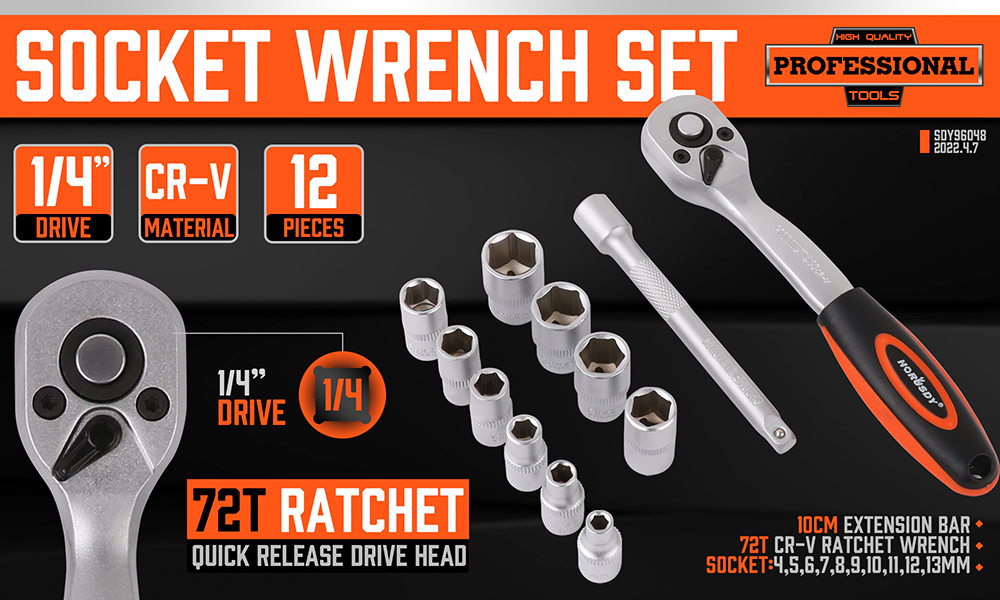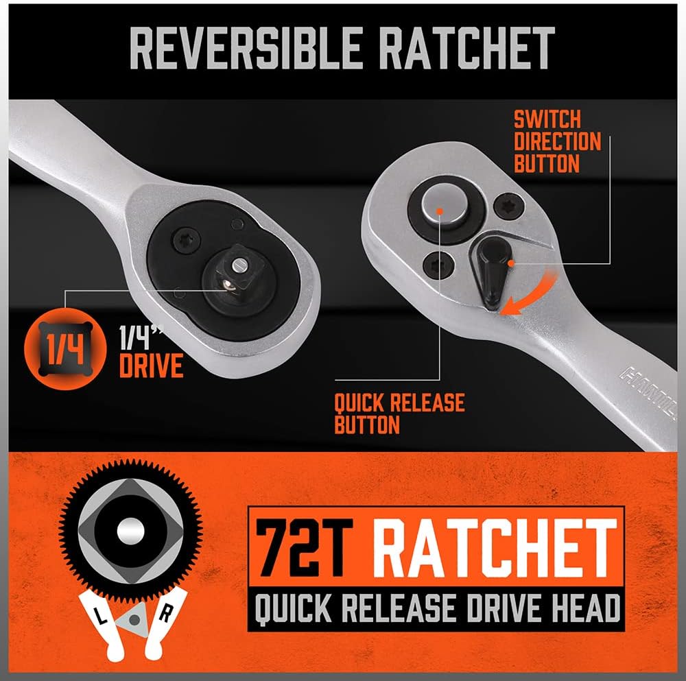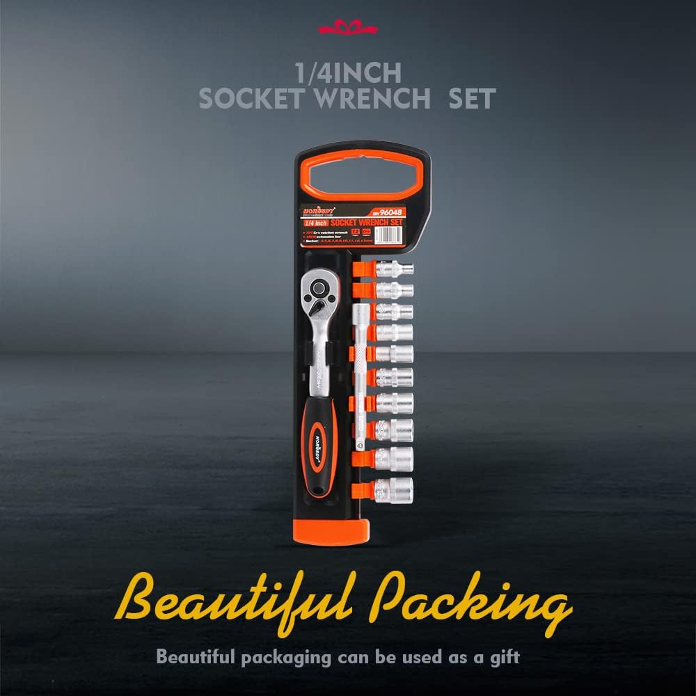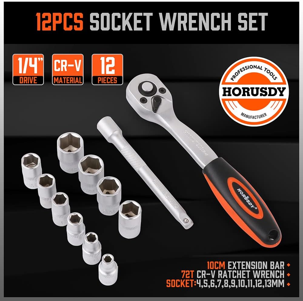 HORUSDY 12 قطعة 1/4 بوصة مجموعة مفاتيح ربط بسقاطة، مجموعة مقابس محرك، مآخذ 4 مم - 13 مم ومقبض سقاطة سريع التحرير وشريط تمديد 10 سم