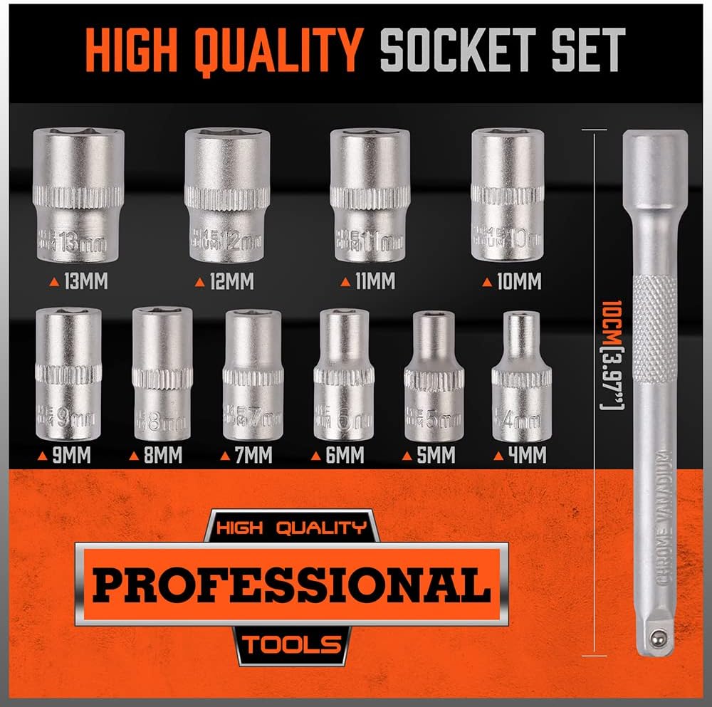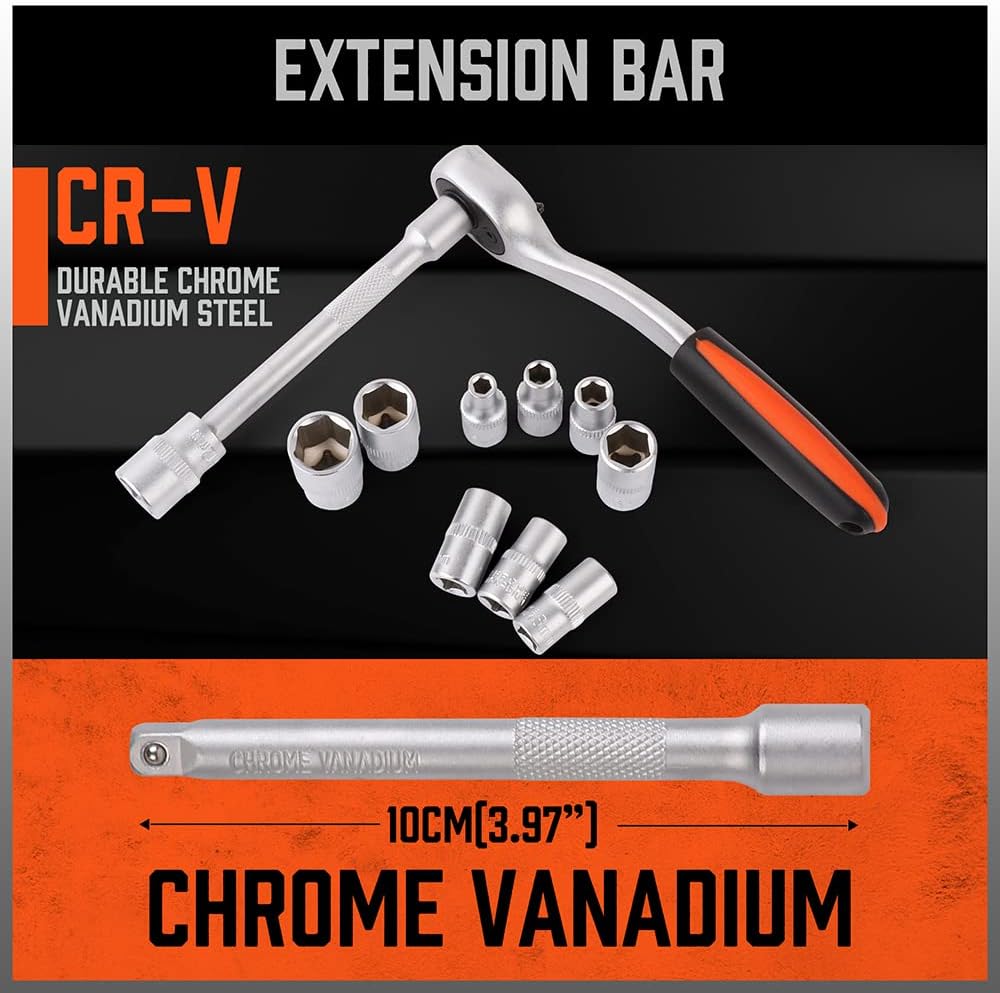 - مجموعة مقابس المحرك هذه مصنوعة من فولاذ الكروم والفاناديوم عالي الجودة. هيكل مزخرف بطبقة نهائية من Cr-V لتحمل بيئة العمل المسببة للتآكل.