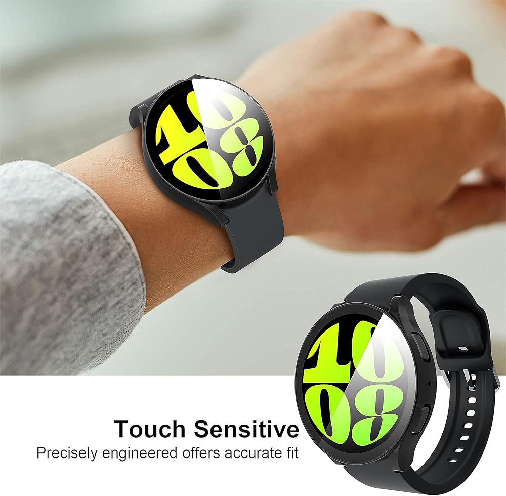 Suoman 2 Pack لساعة Samsung Galaxy Watch 6 مقاس 44 مم، حافظة حماية للشاشة، [مضادة للخدش] واقي زجاجي مقسى + مجموعة غطاء حماية غير لامع من البولي كربونات لساعة Galaxy Watch 6 مقاس 44 مم - أسود + أسود