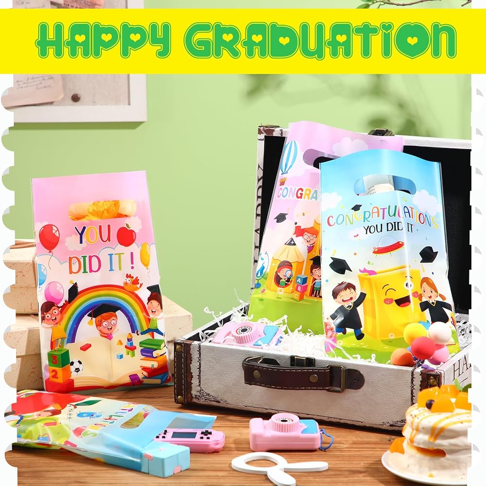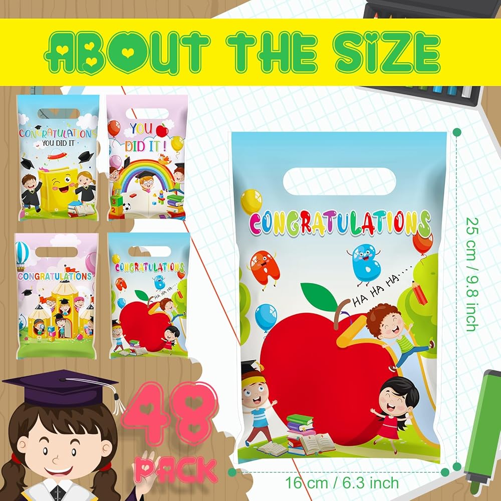 Measurement Details: each plastic favor bag for kindergarten graduation parties measures about 9.84 x 6.3 inches/ 25 x 16 cm, which can conveniently hold gift cards, sweets, cookies, chocolates, and more; Please confirm the size before purchase