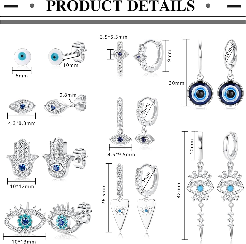 Sanfenly 9 أزواج من أقراط العين الشريرة للنساء 14 قيراط فضية مطلية بالذهب عين الشر Huggie هوب أقراط متدلية وأقراط مسمار مجموعة أنيقة بيضاء زرقاء مكعبة الزركون العين الأقراط